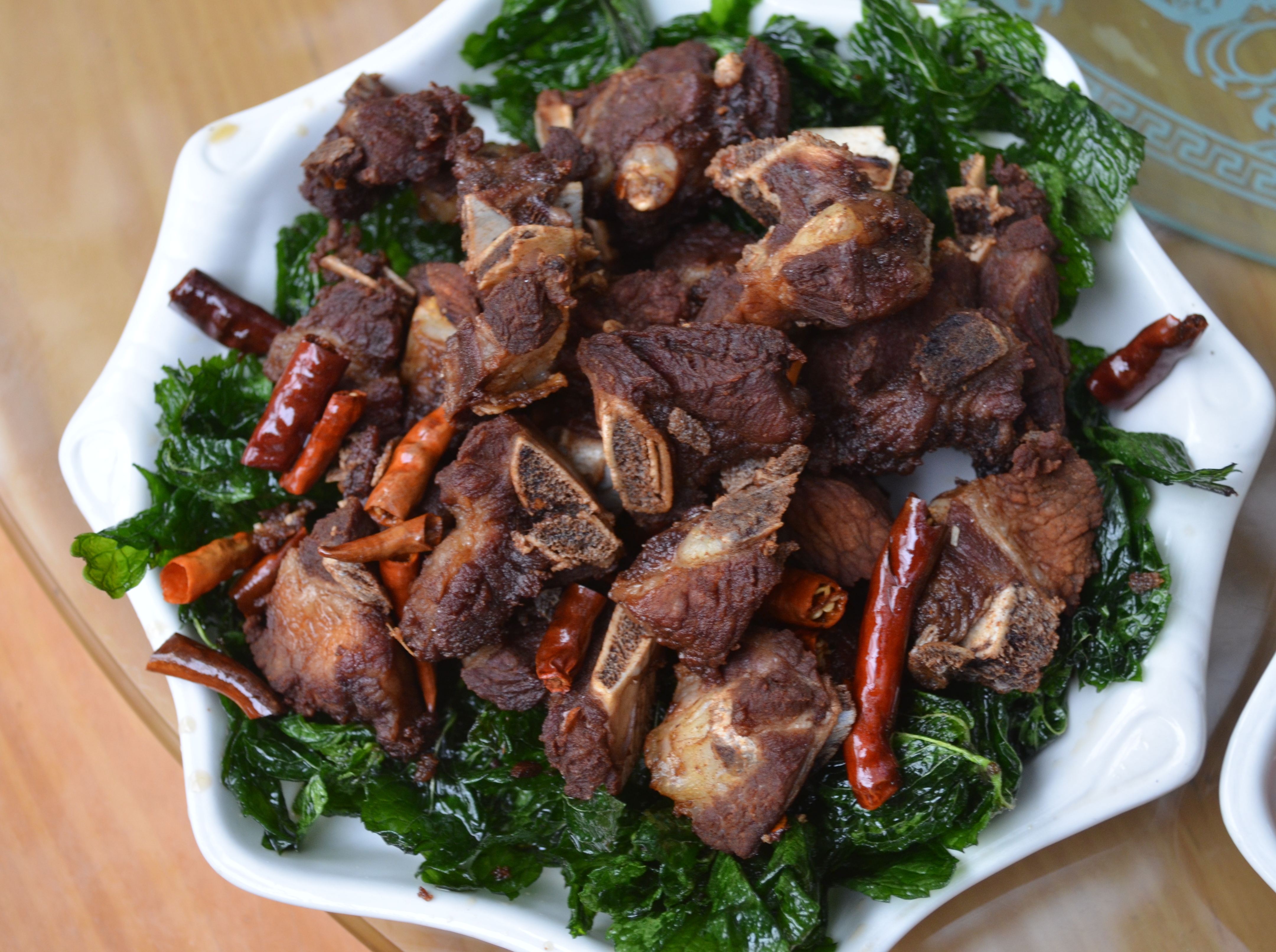 Deep-fried ribs with mint and chilis.