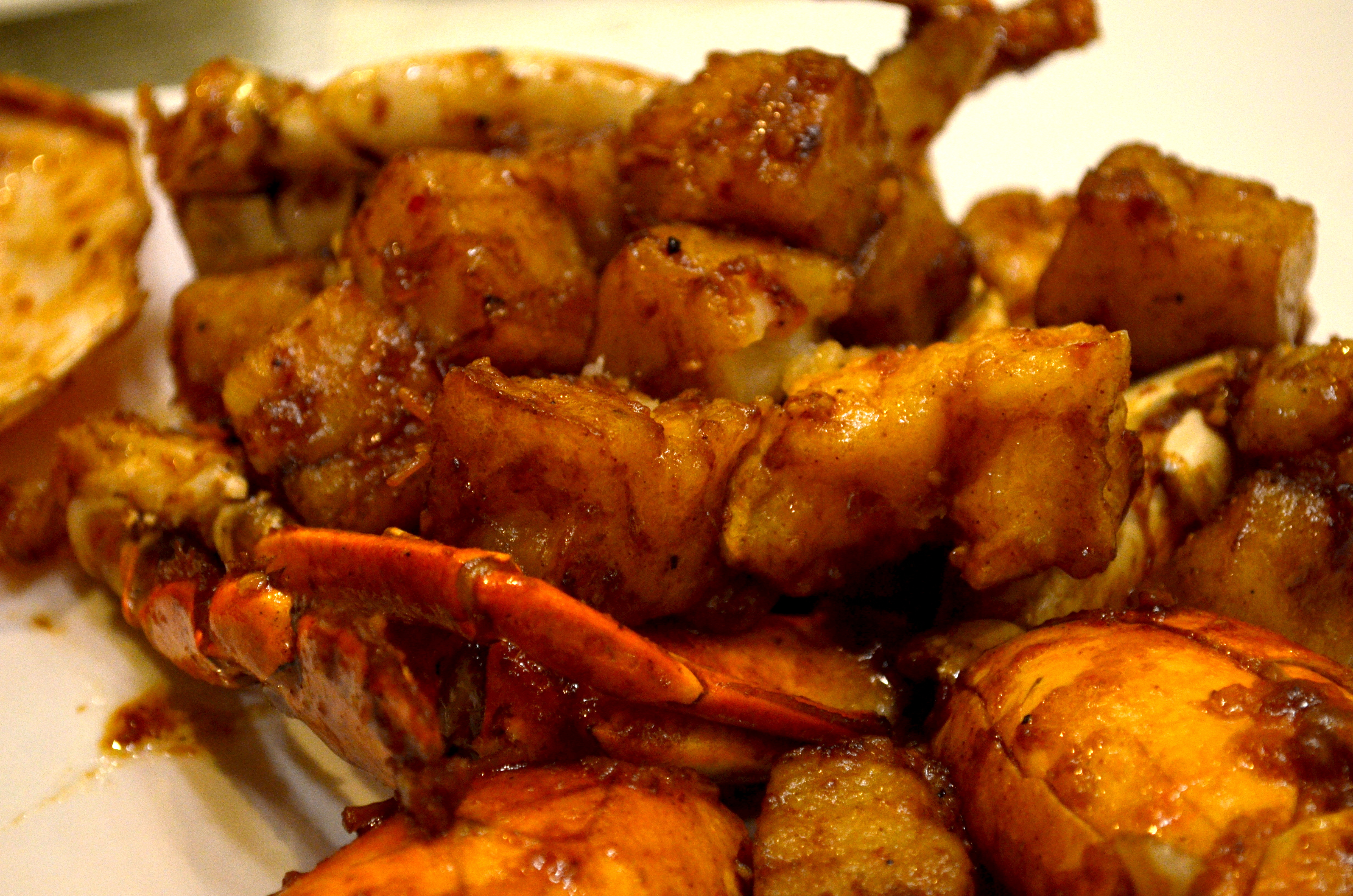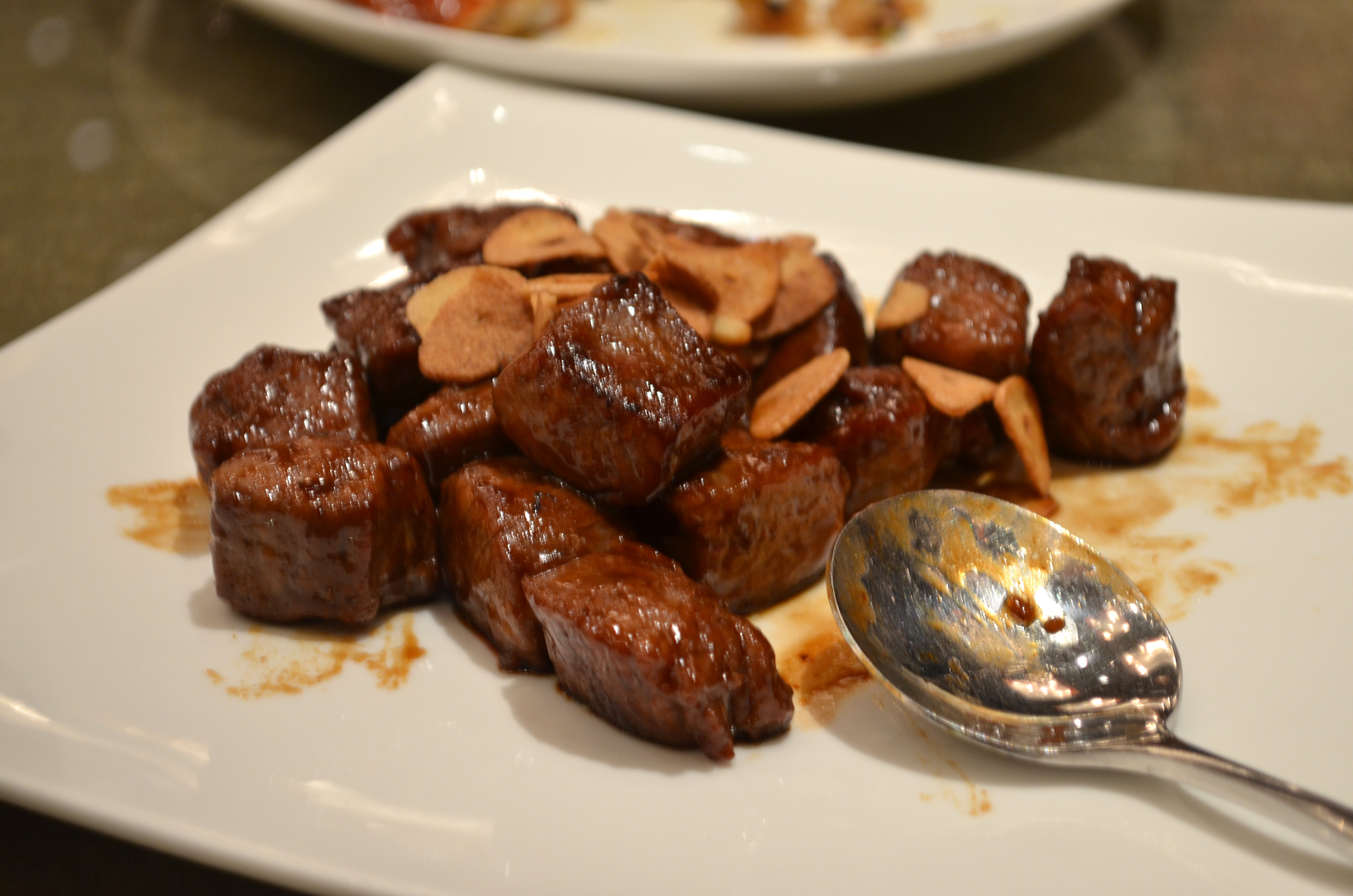 Among our favorite seafood dishes were sautéed crab with turnip cake (market price) and fried shrimp-stuffed salt and pepper squid. Ever thoughtful and detail-conscious, Imperial provided disposable gloves for the hands-on crab lovers among us. The sweet chili shrimp was delicious as well, despite the unappealing photo – the sauce in particular was great on rice.