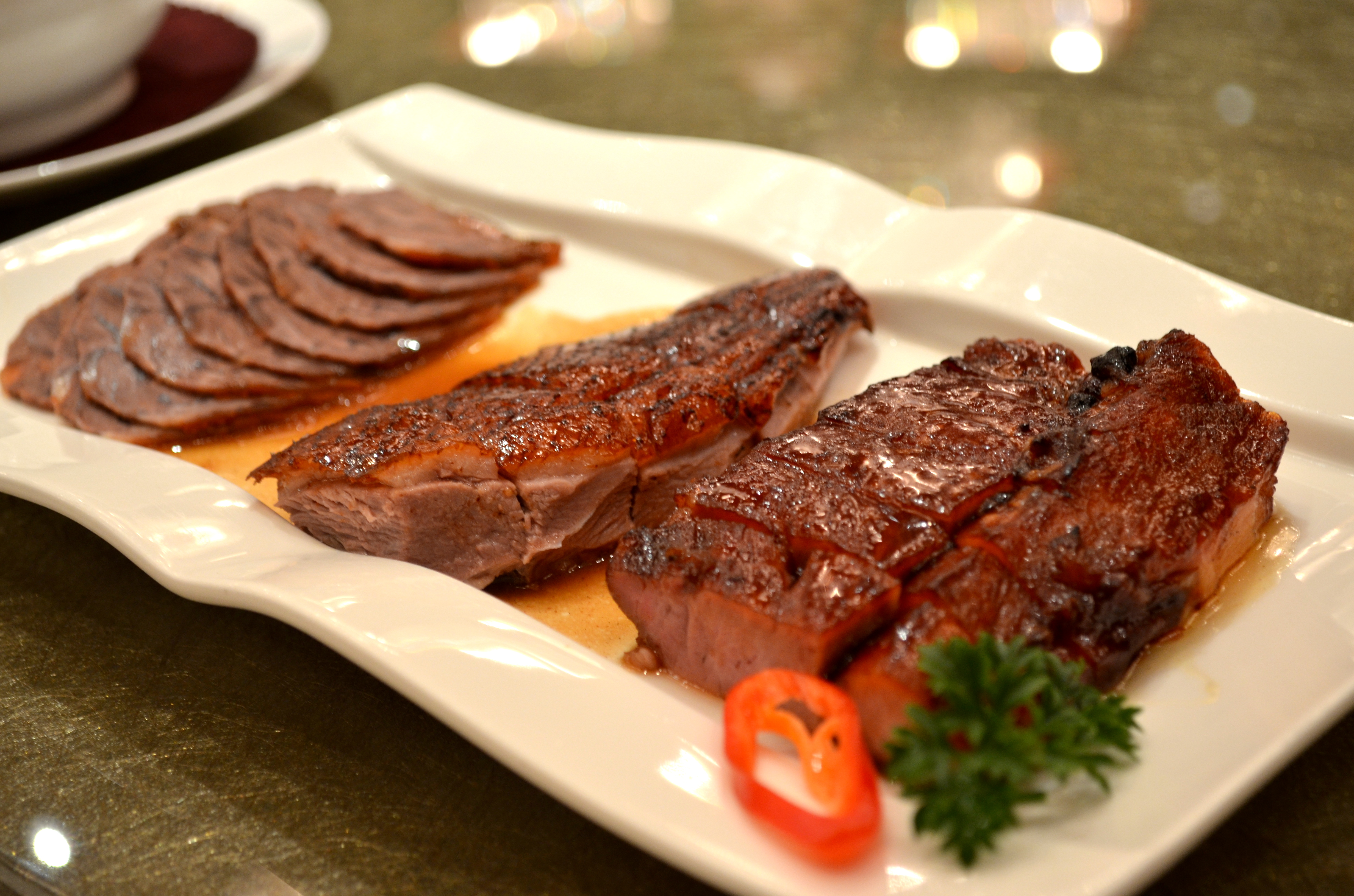 We started dinner with a simple but flavorful roast meats platter (138RMB for two, 188RMB for three) – juicy bites of smoky roast goose, sweet chashao pork, and cold braised beef shank.