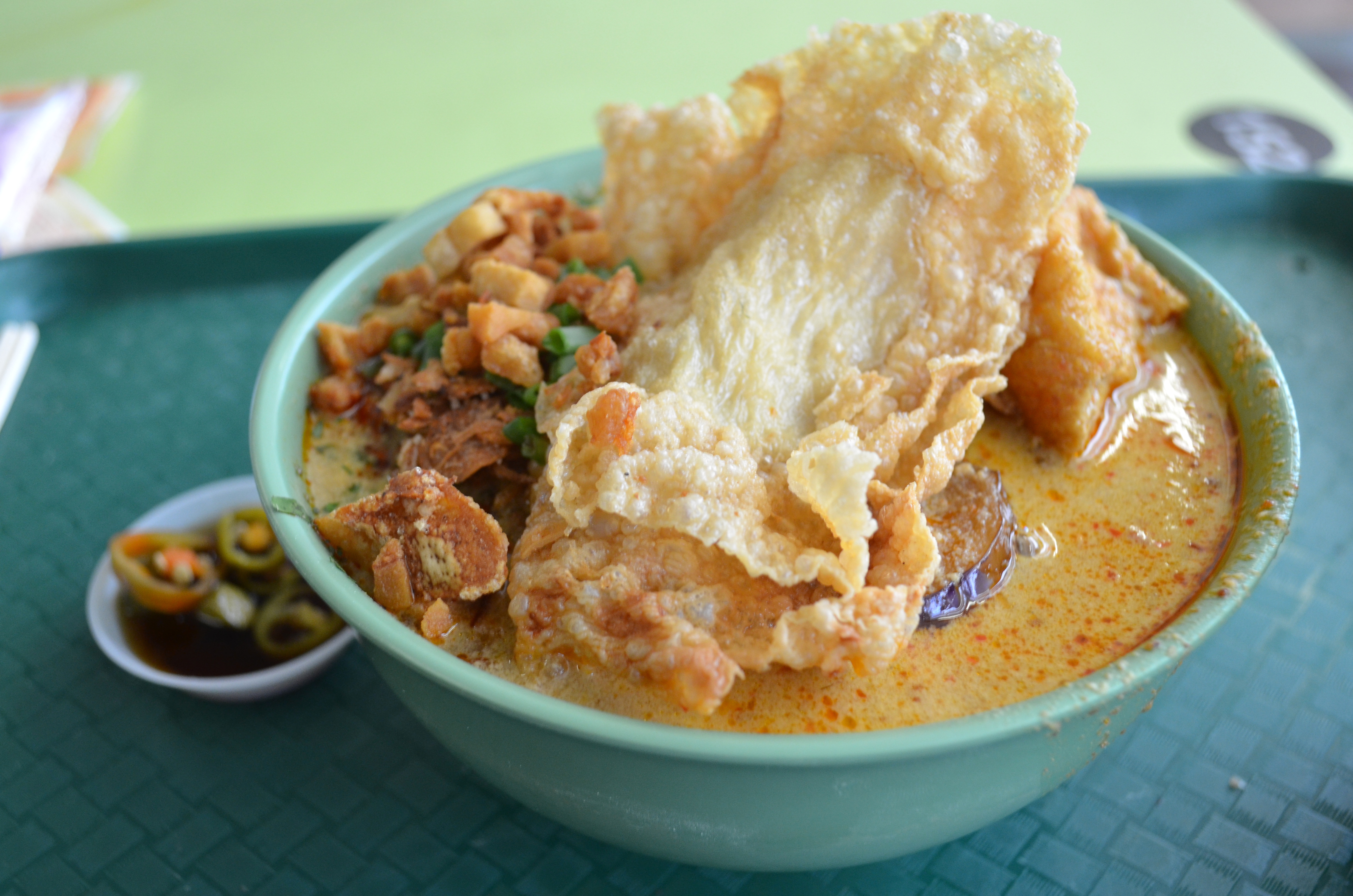 The bowl came out hot and spicy-looking, with a swirl of chili oil and a small side of pickled chili peppers. This twisted sheet of fried tofu lay across a golden, curry-fragrant bowl of soup. Condiments like pork cracklings and chopped green onions are generously DIY at the counter.