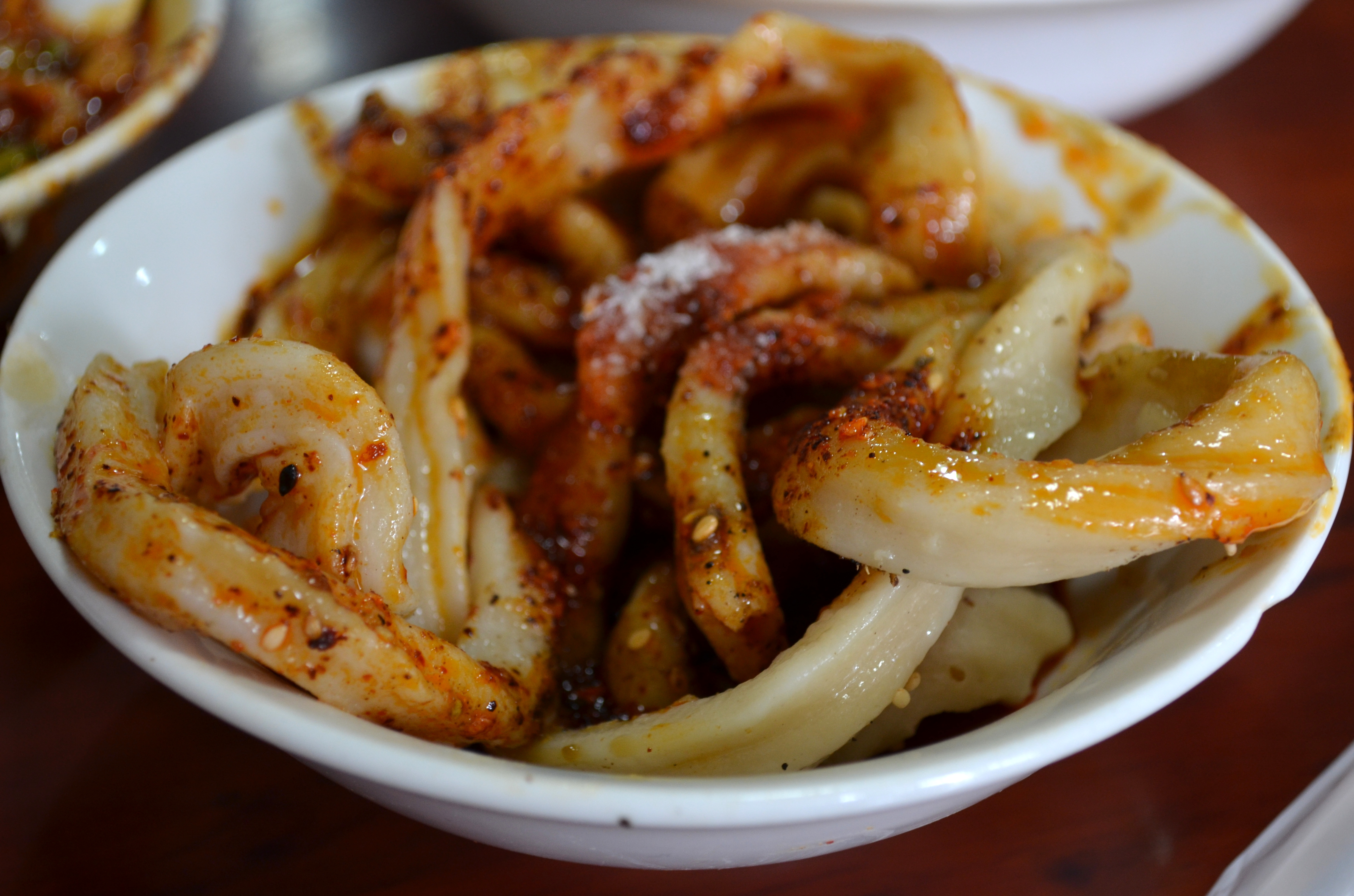 The dumplings were quite tasty, with a fatty mildness that balanced out the havoc that the red-oil, across our various dishes, was collectively wreaking on our taste buds and sweat glands. Mung bean jelly to me is more a summer thing (I don’t know if that’s traditionally true at all), but the tough part about this version was that there was just so much damn MSG that we had to literally dust off our bowl before mixing it. The steamed beef was our least favorite; it was like a poor man’s version of 麻香排骨, sticky-rice-wrapped steamed spare ribs perfumed with peppercorn oil, but in somewhat unappealing baby-food form.