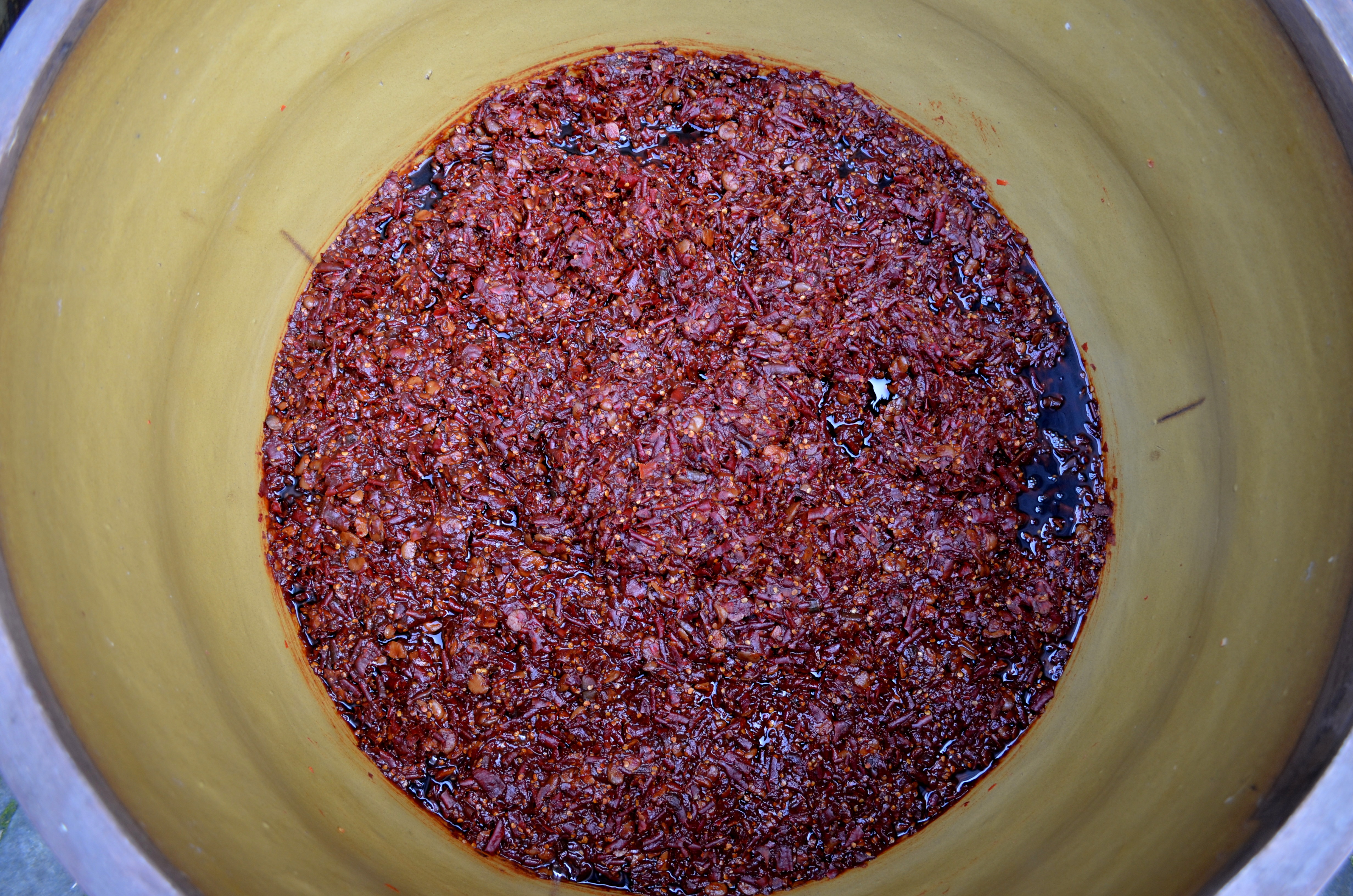 But the real stars of the show were yet to come. First, the stunning array of massage standing pots of fermenting chili bean sauce (豆瓣酱, or doubanjiang), which must be churned daily for a year, with exposure to the sun and open air. Each row of the vats represents a different stage in that yearlong process. Pi County is unique (the Chinese name is Pixian) as the most famous producer of chili bean sauce, so we were smack dab in the middle of where the magic happens.