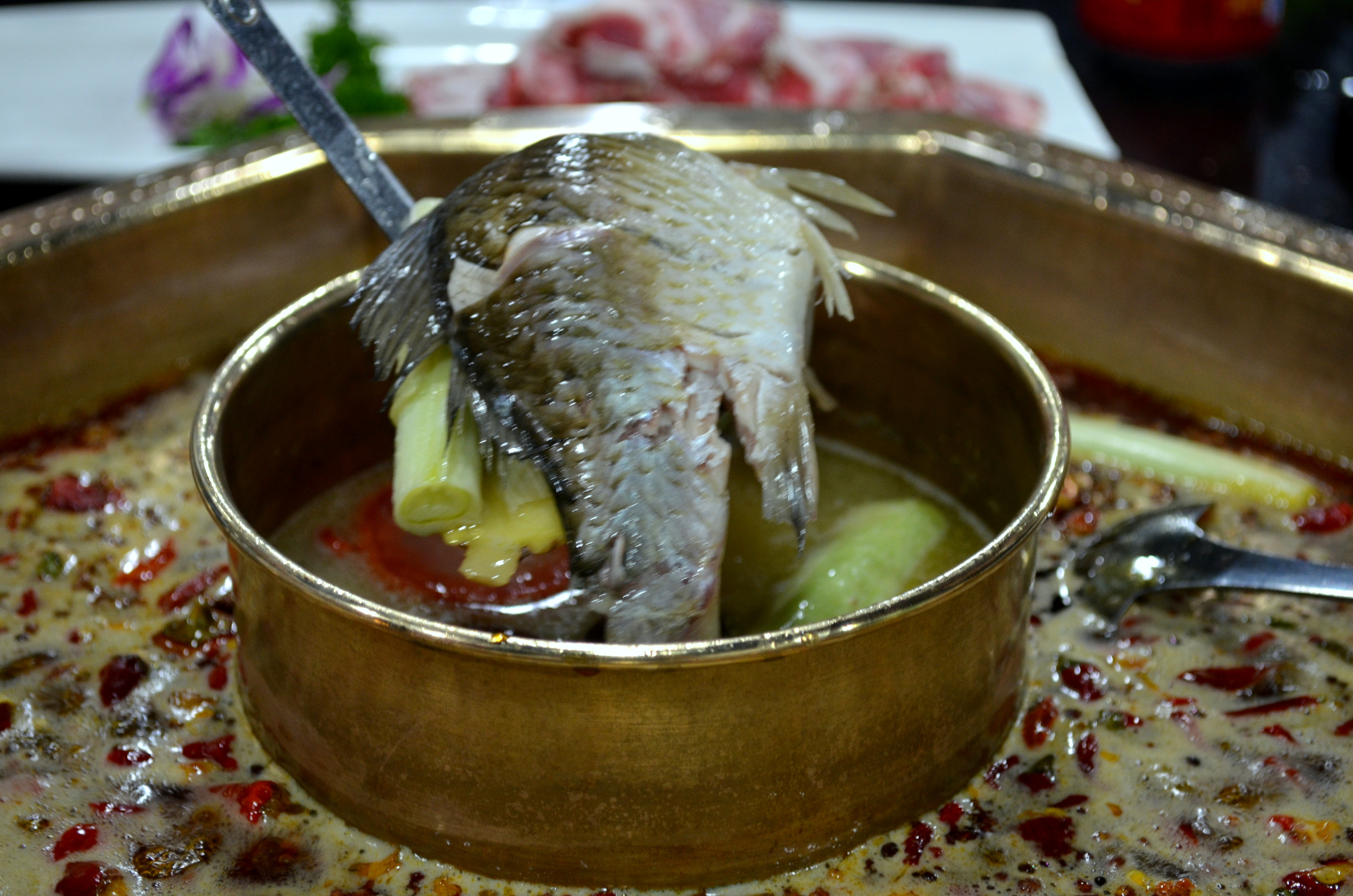 Hey, look! We found a whole fish, just chillin’ in the non-spicy middle part of the hotpot.