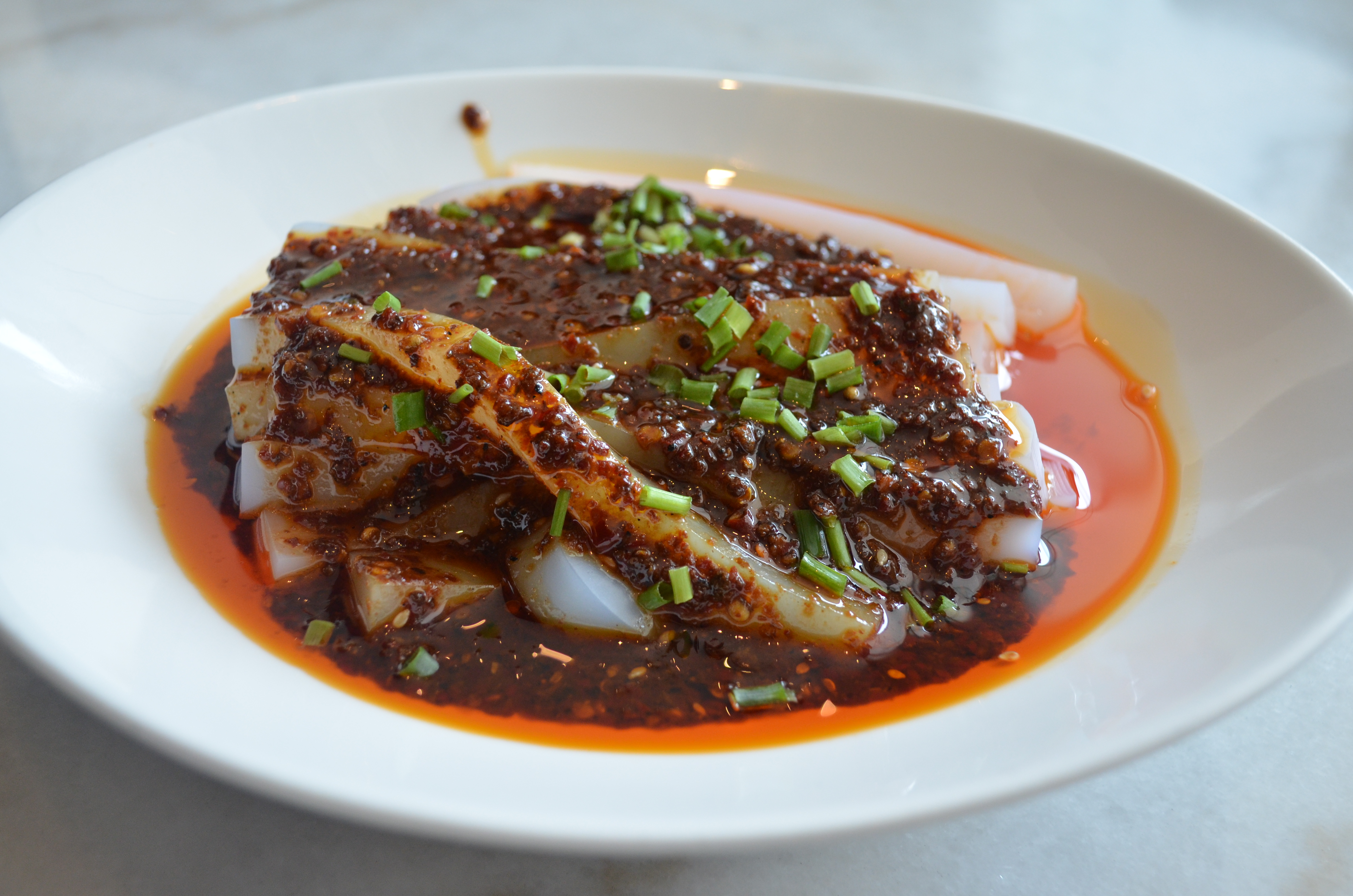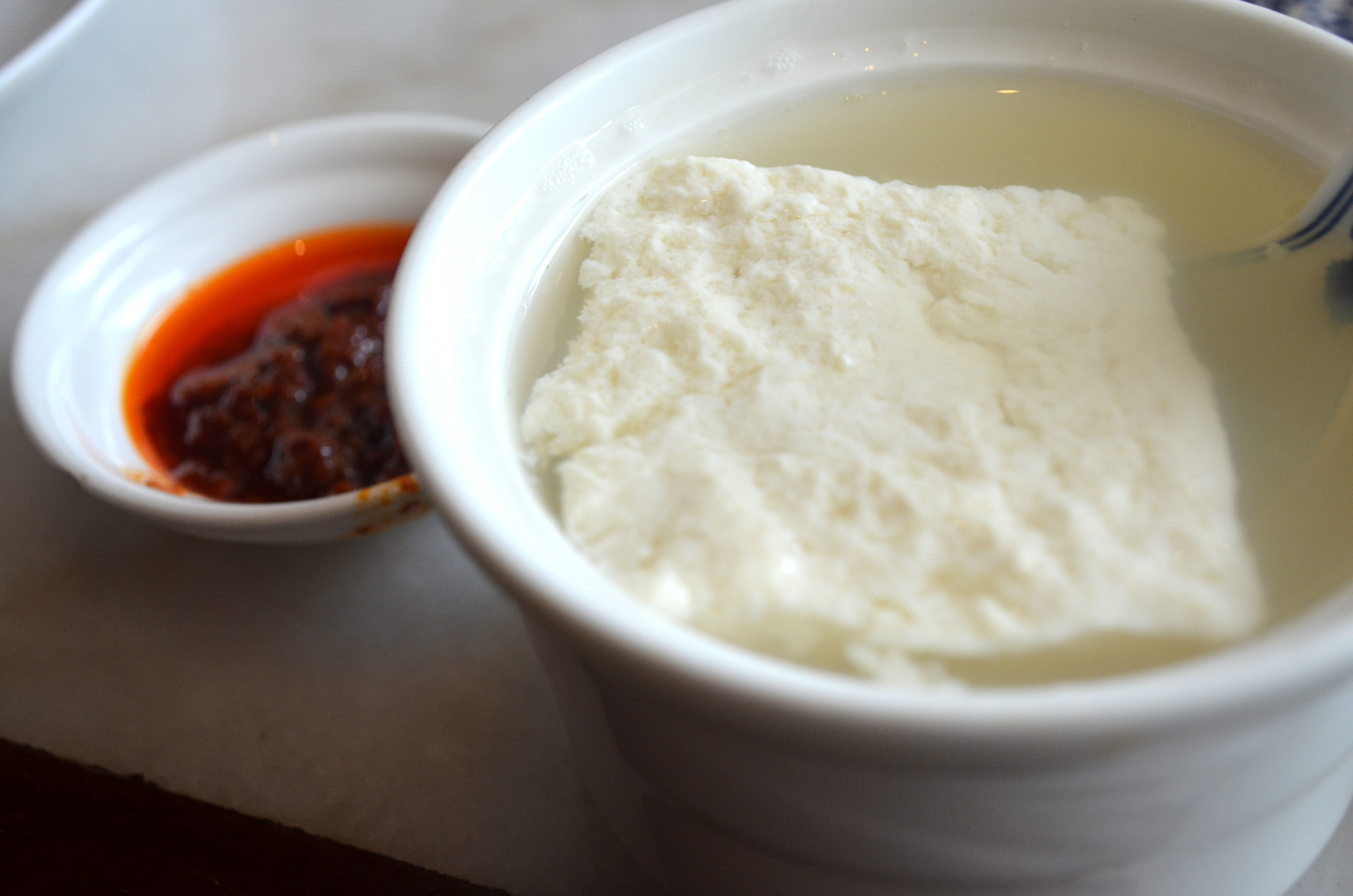 This dish with a side of chili paste was similarly simple, just a fresh slab of homemade tofu, nothing else, firm yet springy.