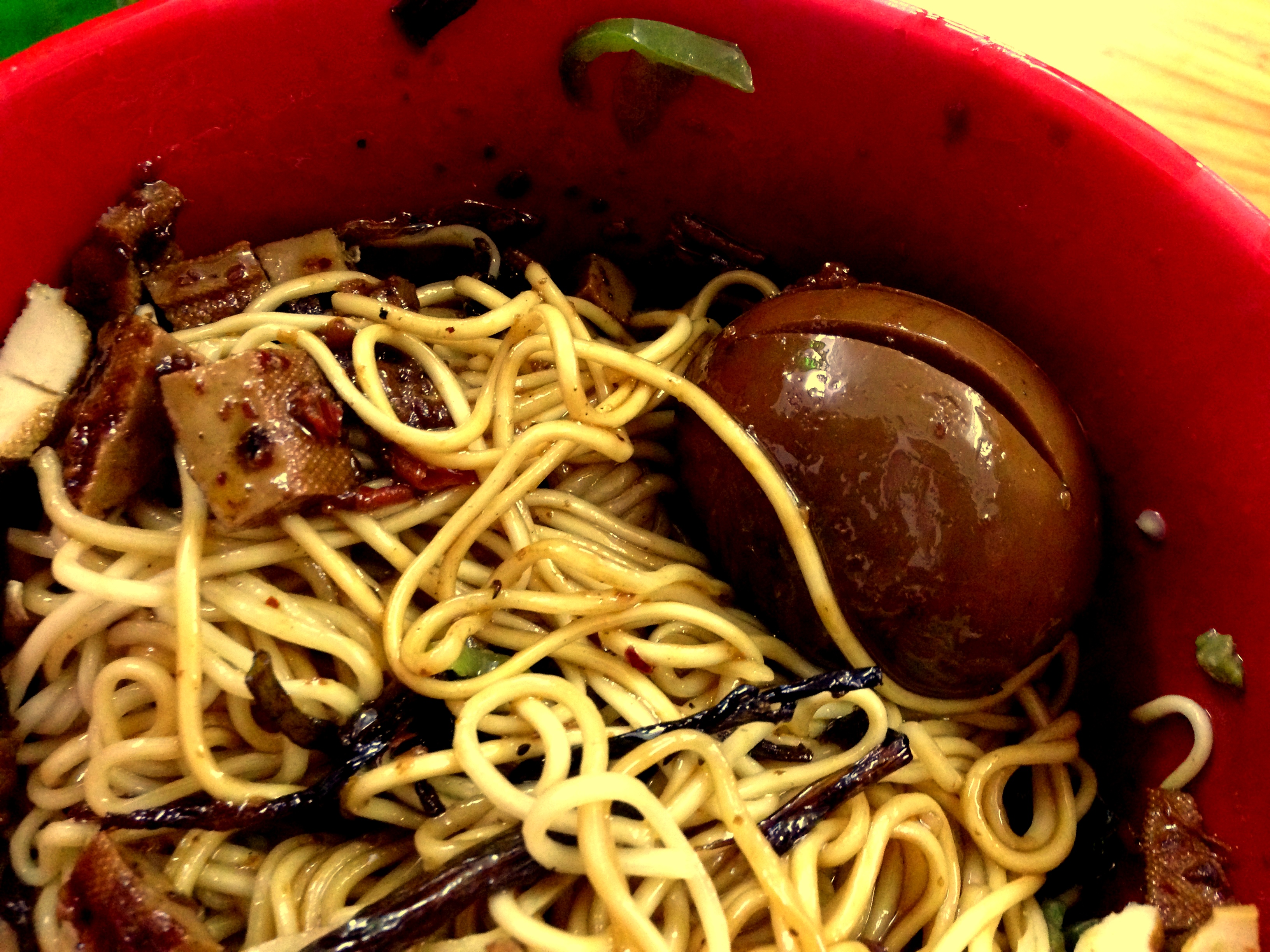 Here, the sauce is more “saucy” than oil, which is unfortunate because the sauce is also on the thin side, resulting in a bit slimier of noodles than I would say is ideal. But on the flip side, a big bowl of the stuff is 8RMB including two shallow-fried eggs (荷包蛋).