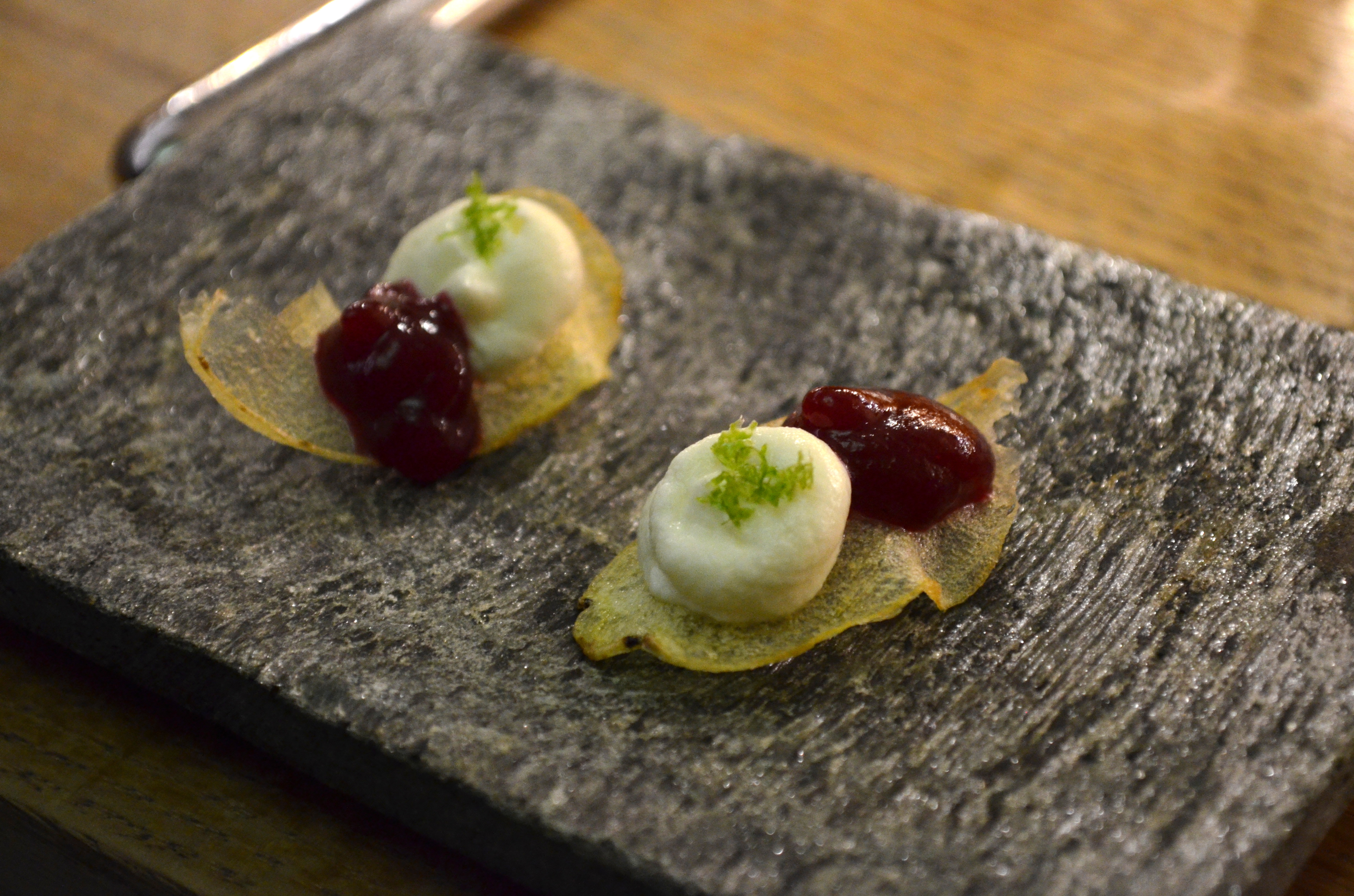 A little amuse-bouche that followed: beet purée and horseradish on a potato crisp.