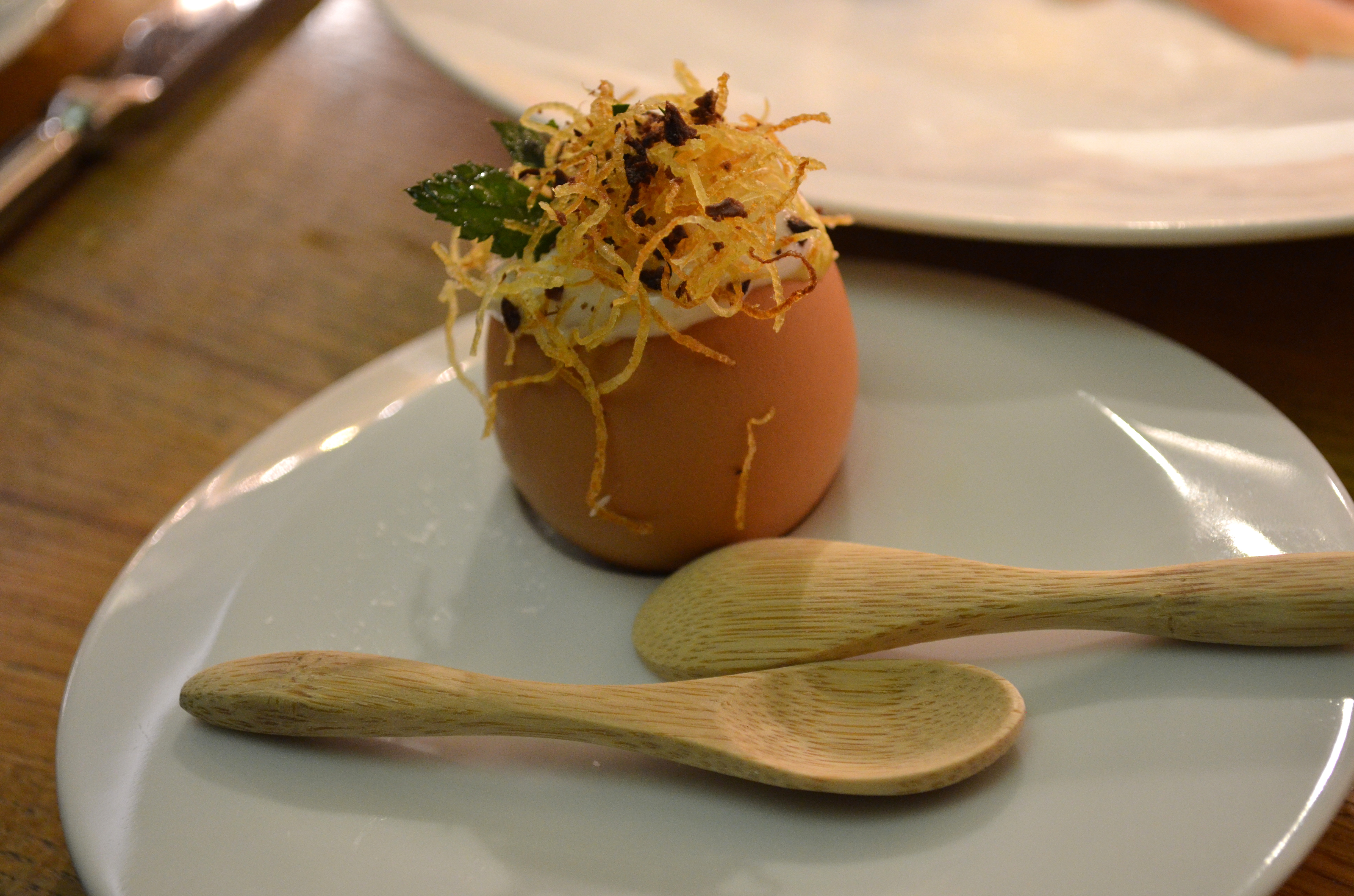 A Knollcrest farm egg with bacalao, potato crisps, and black olive. The egg was soft-scrambled, and melted into the slightly-salted bacalao. The crisps, tangled with a sprig of herb and morsels of black olive, were my favorite part. This was a dish that ended in a flash, but was just perfectly delicate in both presentation and gustatory brevity.