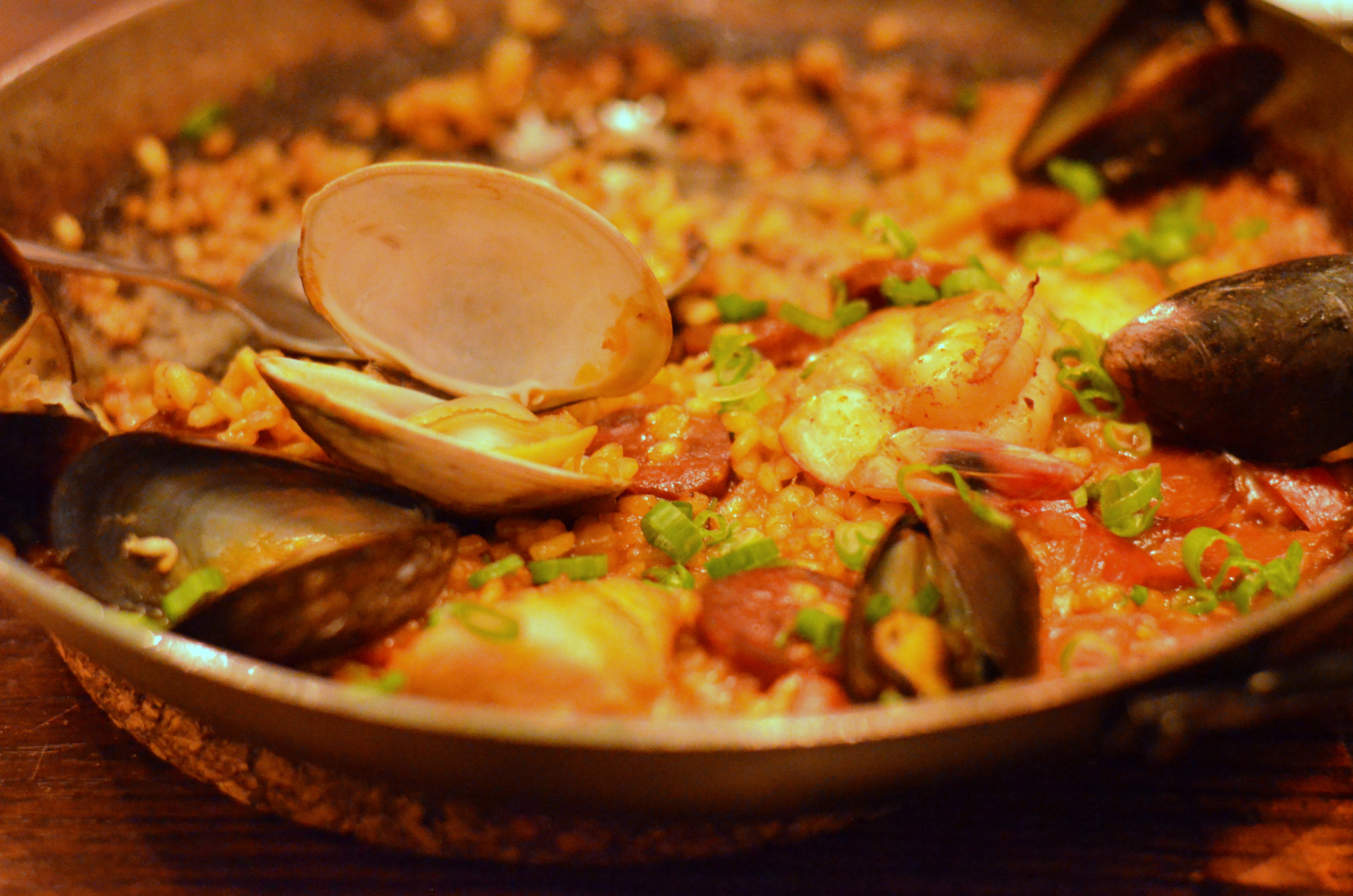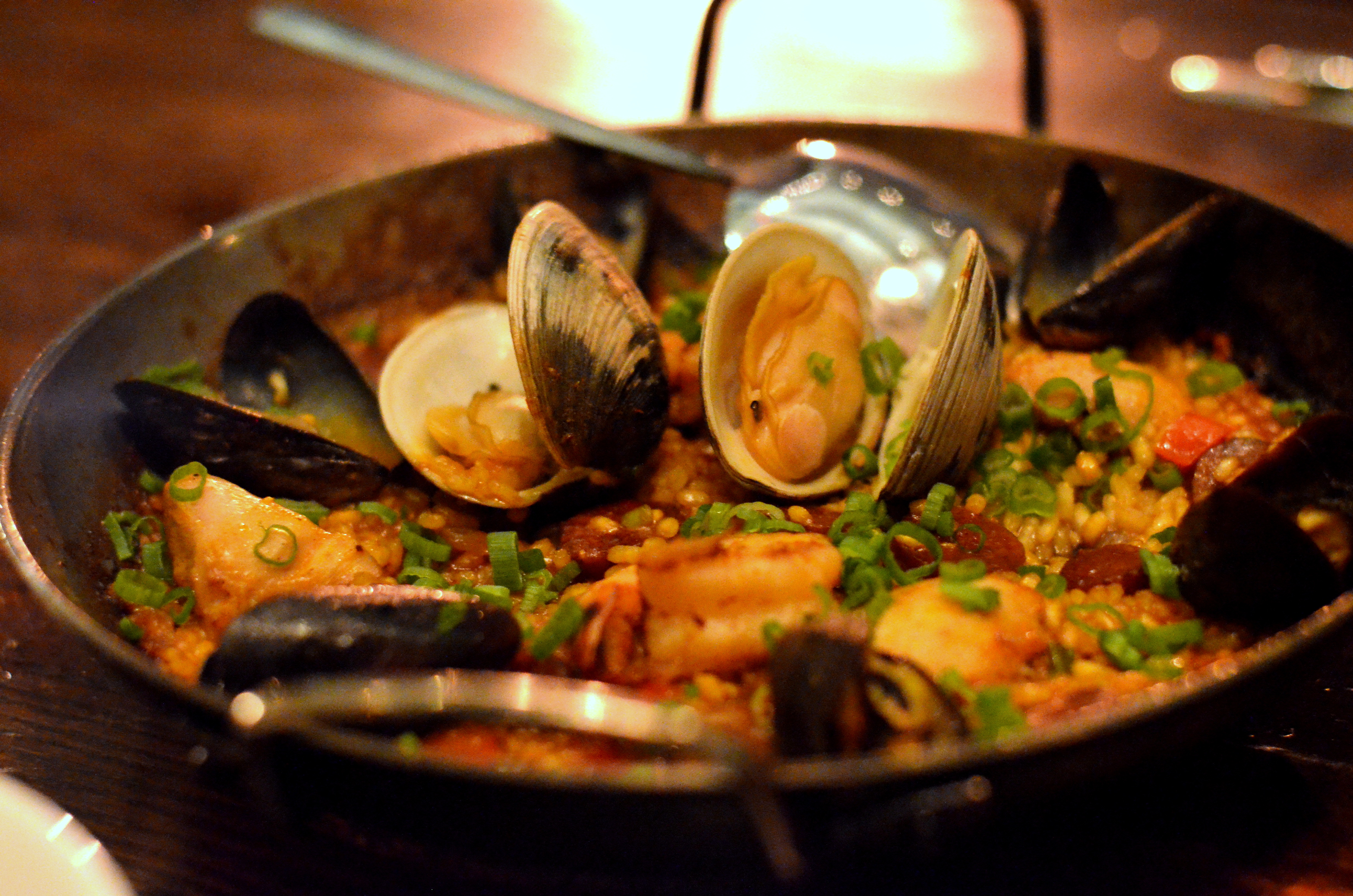 Paella Valenciana: shrimp, mussels, clams, chorizo, chicken and calasparra rice. Our waitress pointedly told us to be unrestrained with the burnt rice at the bottom of the pan, to attack it with our spoons. Good advice, as tomato, mollusk juices, and chicken and chorizo drippings cooked to a crisp are just plain awful delicious.