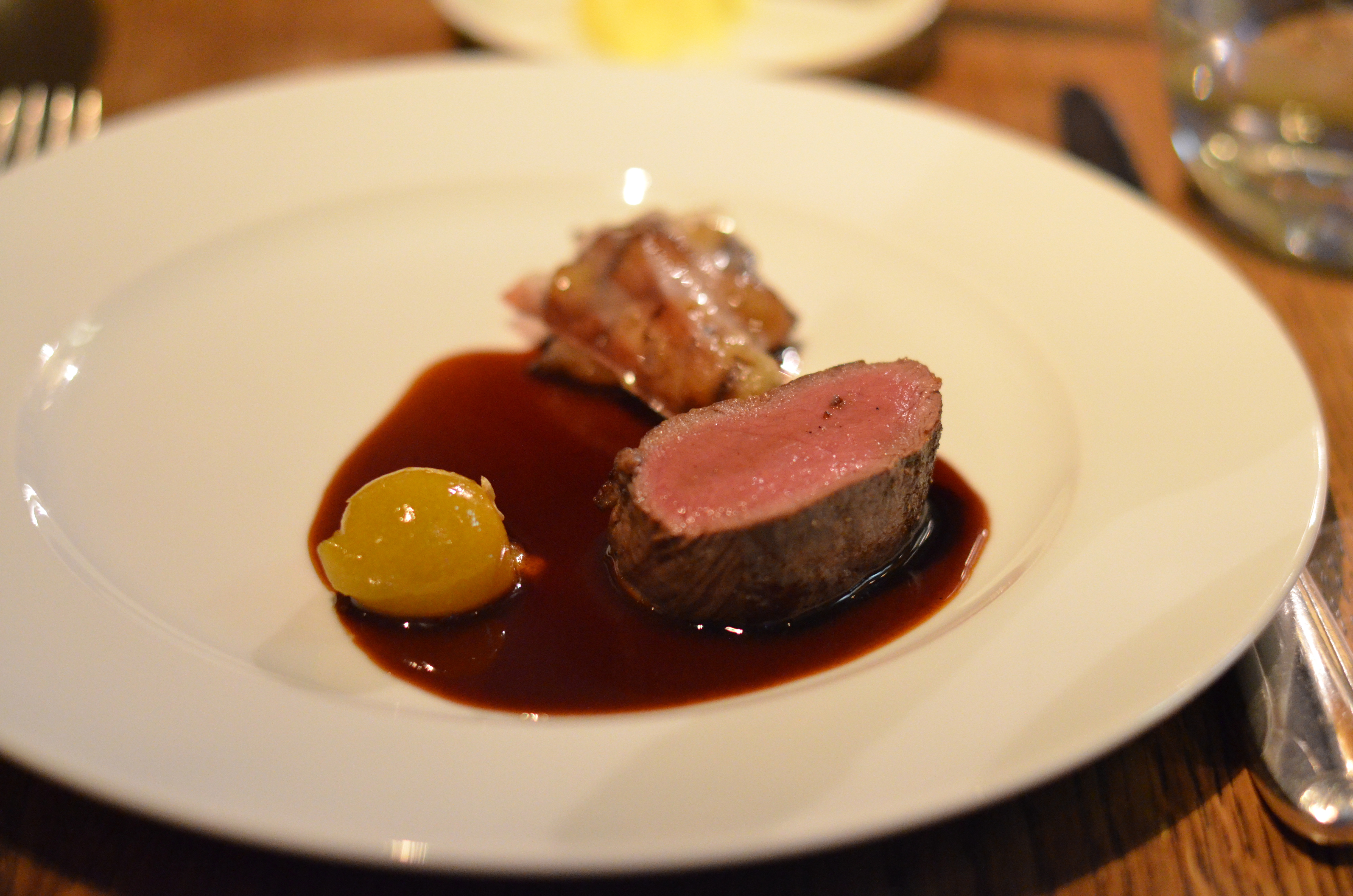 Roasted venison with venison jus, kumquat, and another garnish I don’t remember: