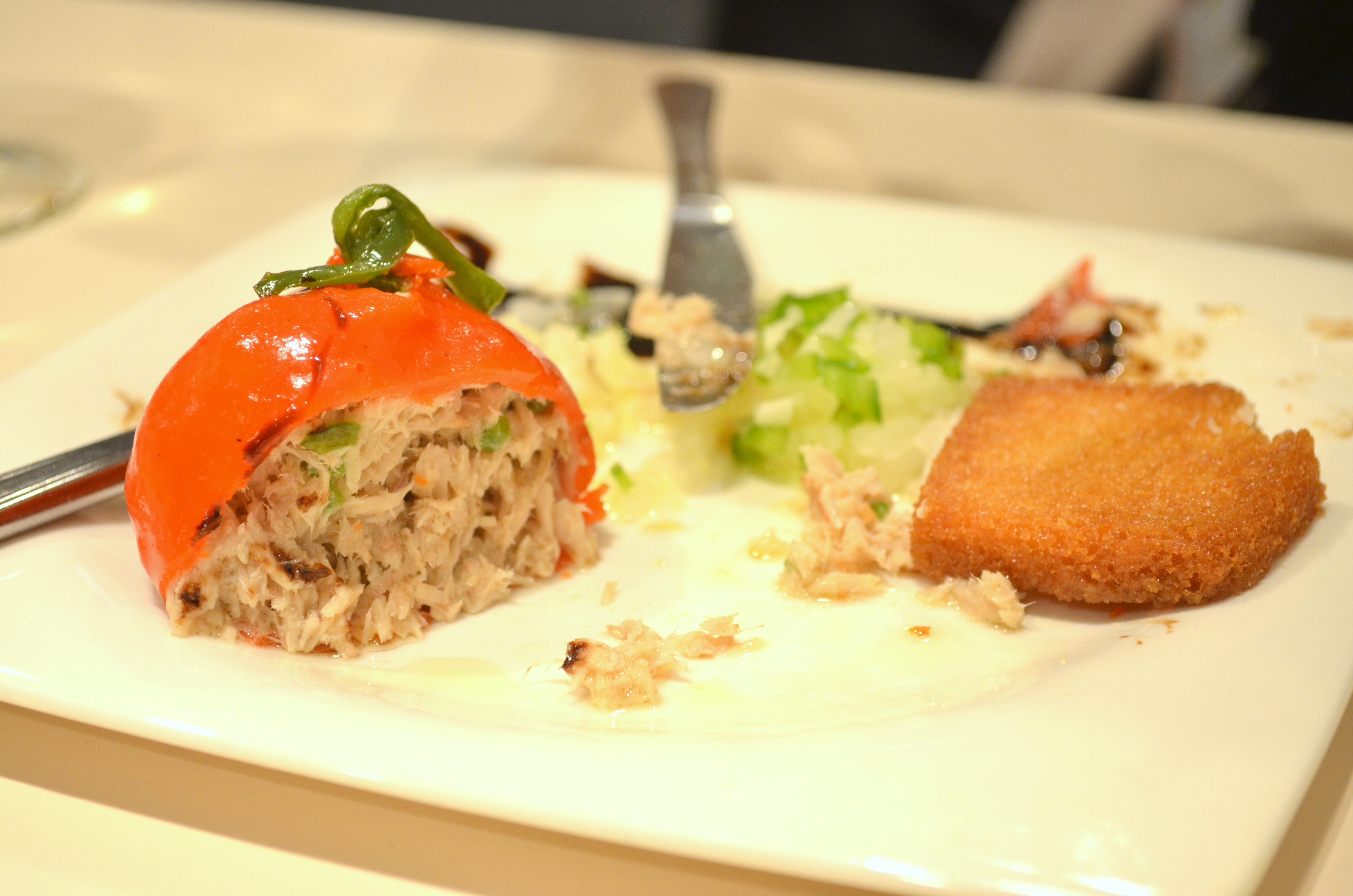 This stuffed pepper (tuna salad), with crouton and chopped onions and balsamico. This happened to be one of Myra’s favorite dishes of the trip, if only because it was surprisingly delicious, or just what we needed at the moment – a common theme throughout our San Sebastian experience, finding a favorite where least expected.