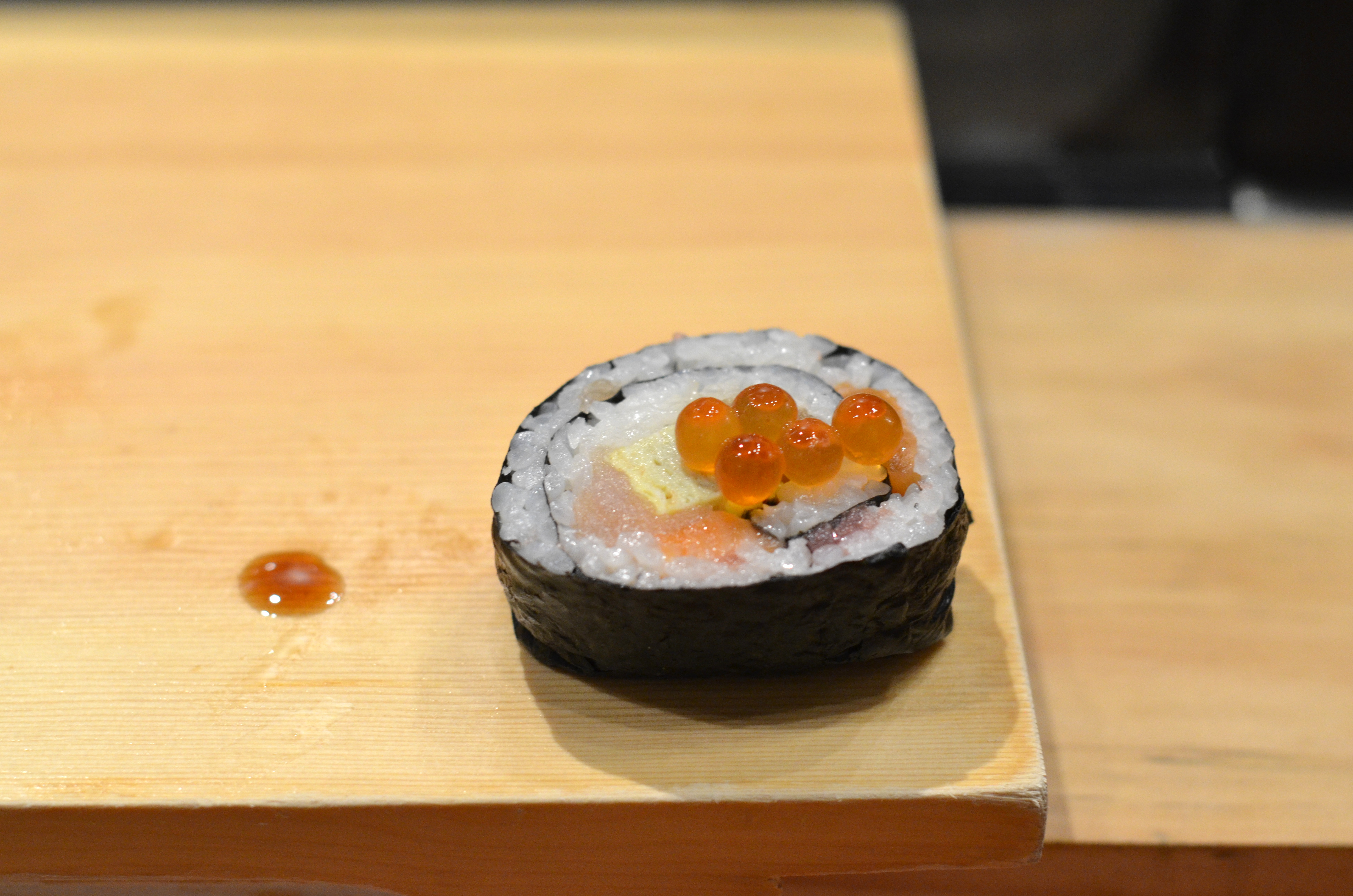 That wrapped up (no pun intended) the omakase portion of the meal, and we tacked on two pieces of the more luxurious offerings on the a la carte menu. A dollop of crab brains (kani miso). Good lord. This visually unappealing glob packs a dense wallop of the intensely satisfying innards that my family and I grew up relishing when tearing into a fresh-steamed crustacean. It’s not for everybody, but for anybody who loves the delightfully dirty process of eating whole crab, this is a concentrated moment of goodness you shouldn’t pass up.
