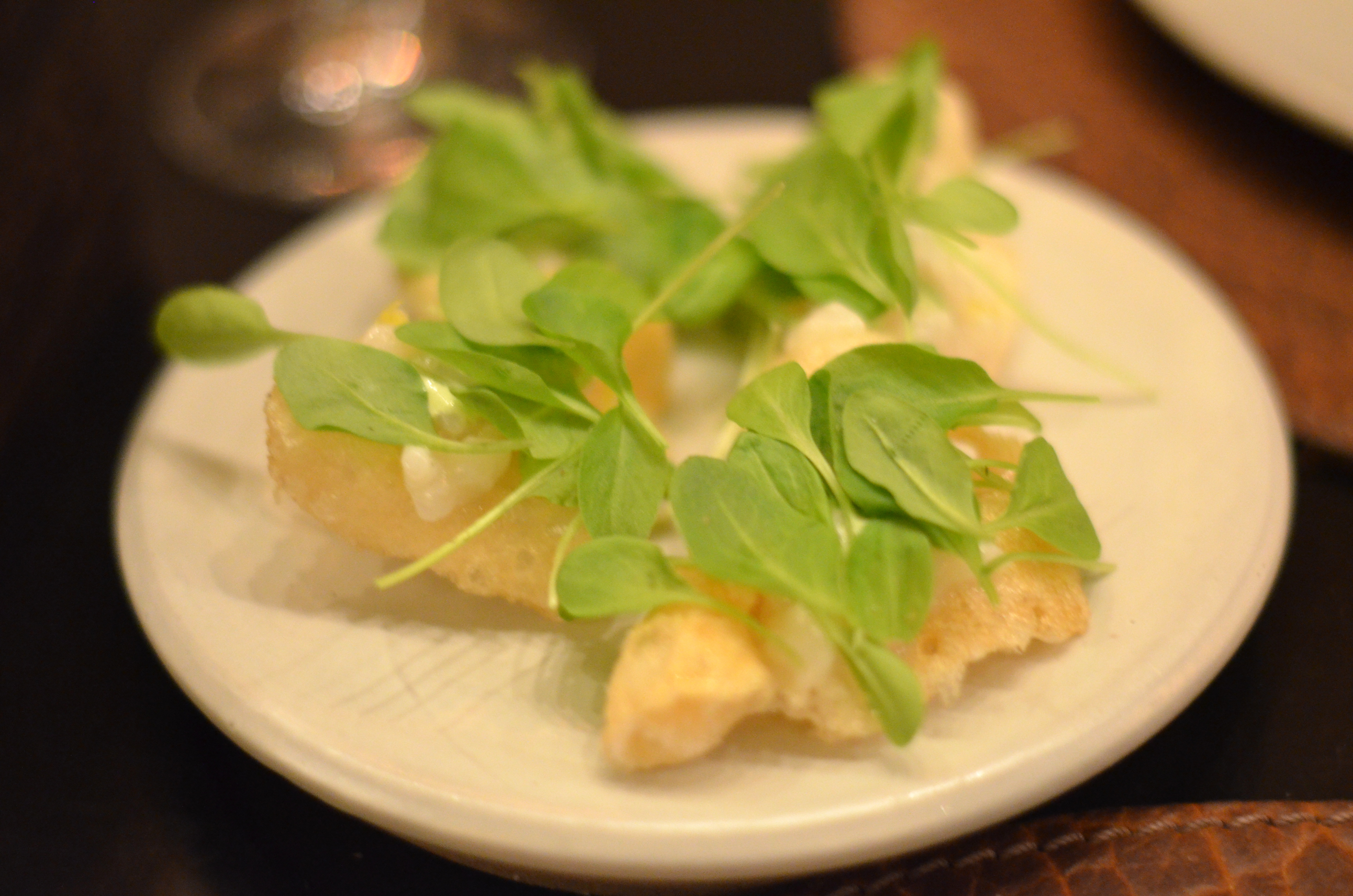 We celebrated an anniversary at Betony, a posh midtown restaurant headed by Chef Bryce Shuman and GM Eamon Rockey, alums of Eleven Madison Park. The dining room exudes luxury, in whatever way that soaring ceilings of relief sculptures and plush, comfortable oval-backed chairs exude luxury. But there’s also something cool, something about the towering exposed brick walls and the elegant tableware, through a kind of plush, dark, rich, velvety, rarefied air of midtown Manhattan.