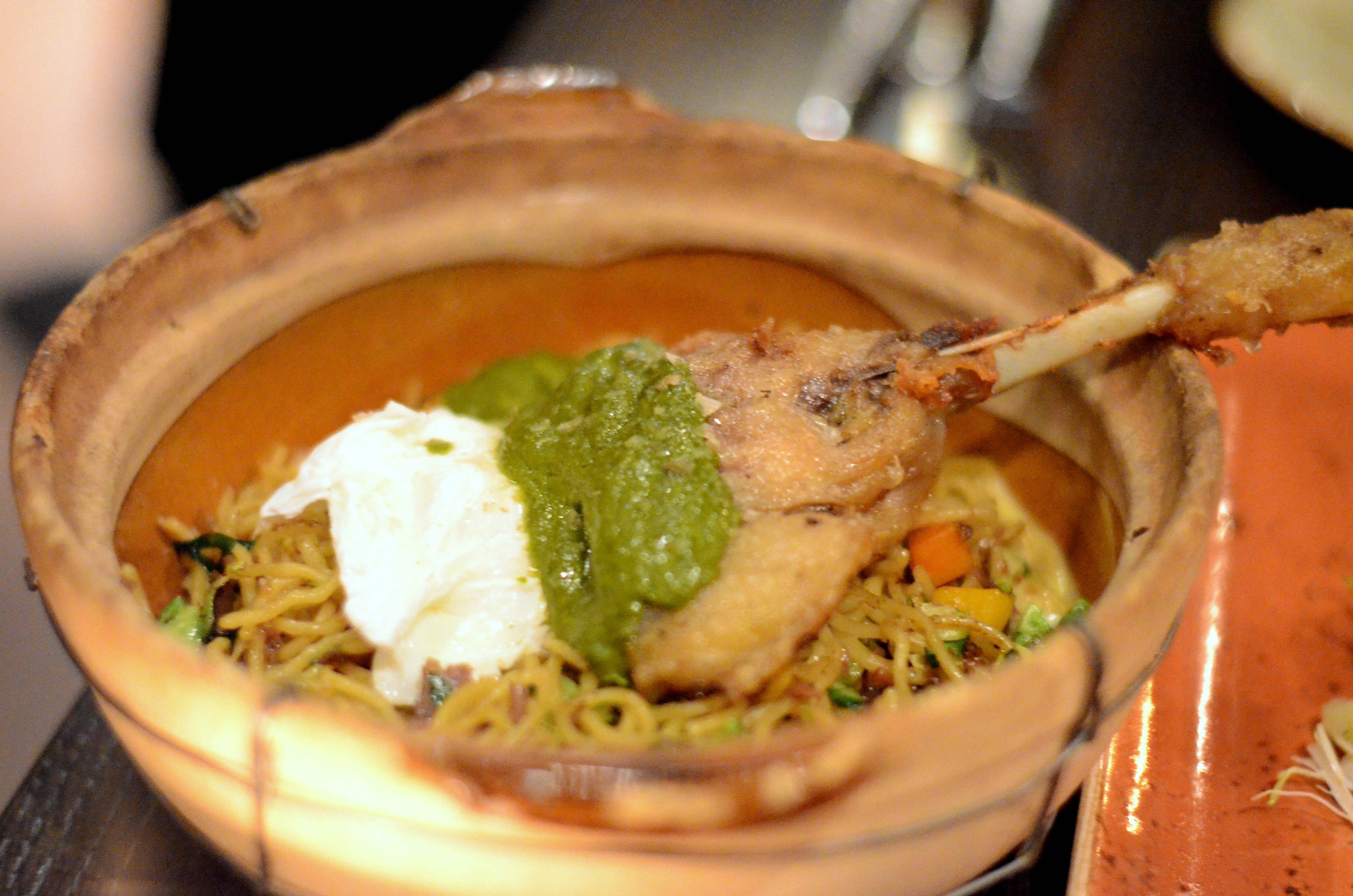 We also got a confit’d leg of duck atop a bowl of wok-fried lo mein, like a Hong Kong-cafeteria dish crossed with a patient French-Indian grandmother’s secret recipe. That it comes from a singular chef’s mind/kitchen is pretty neat.