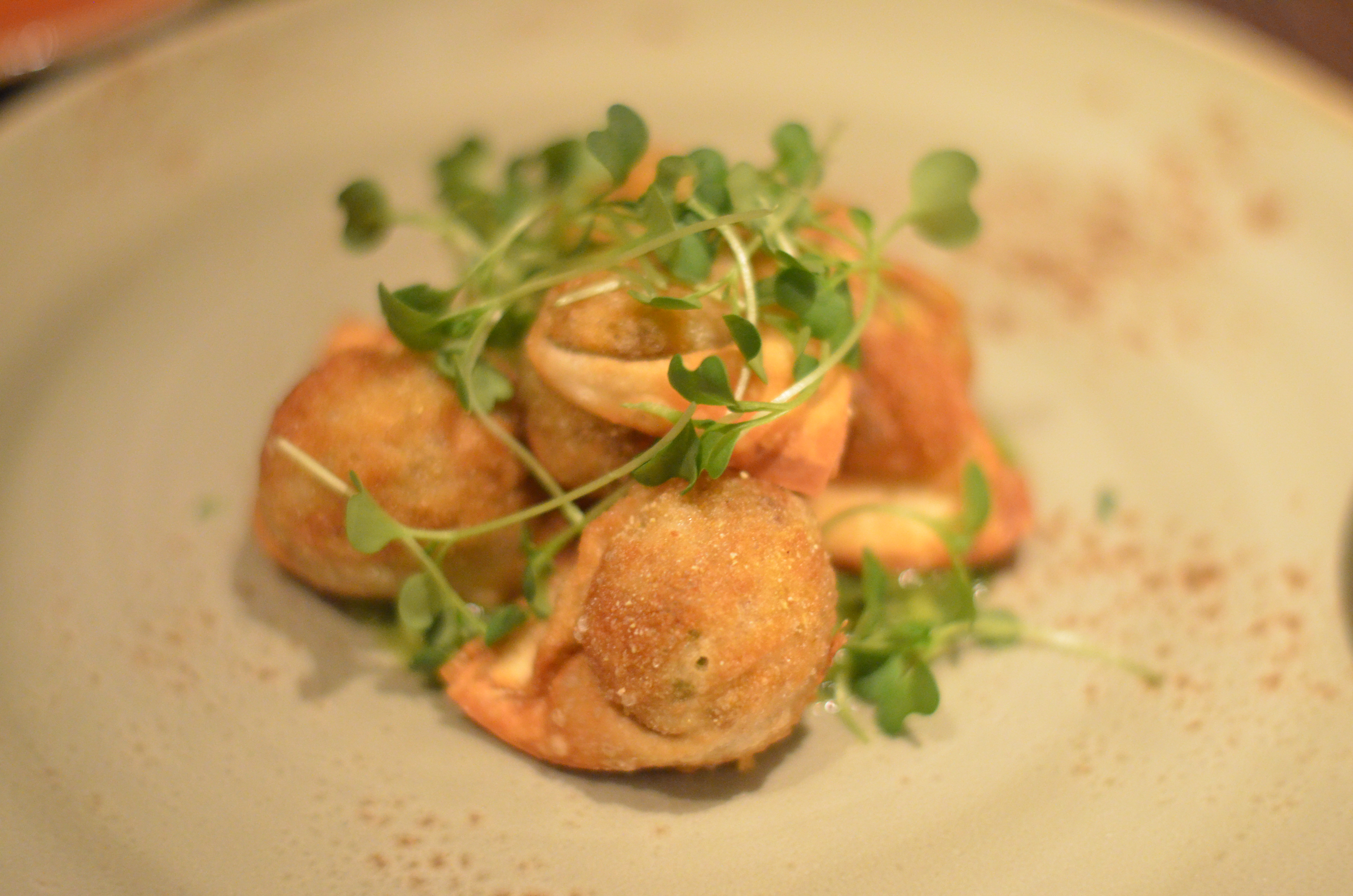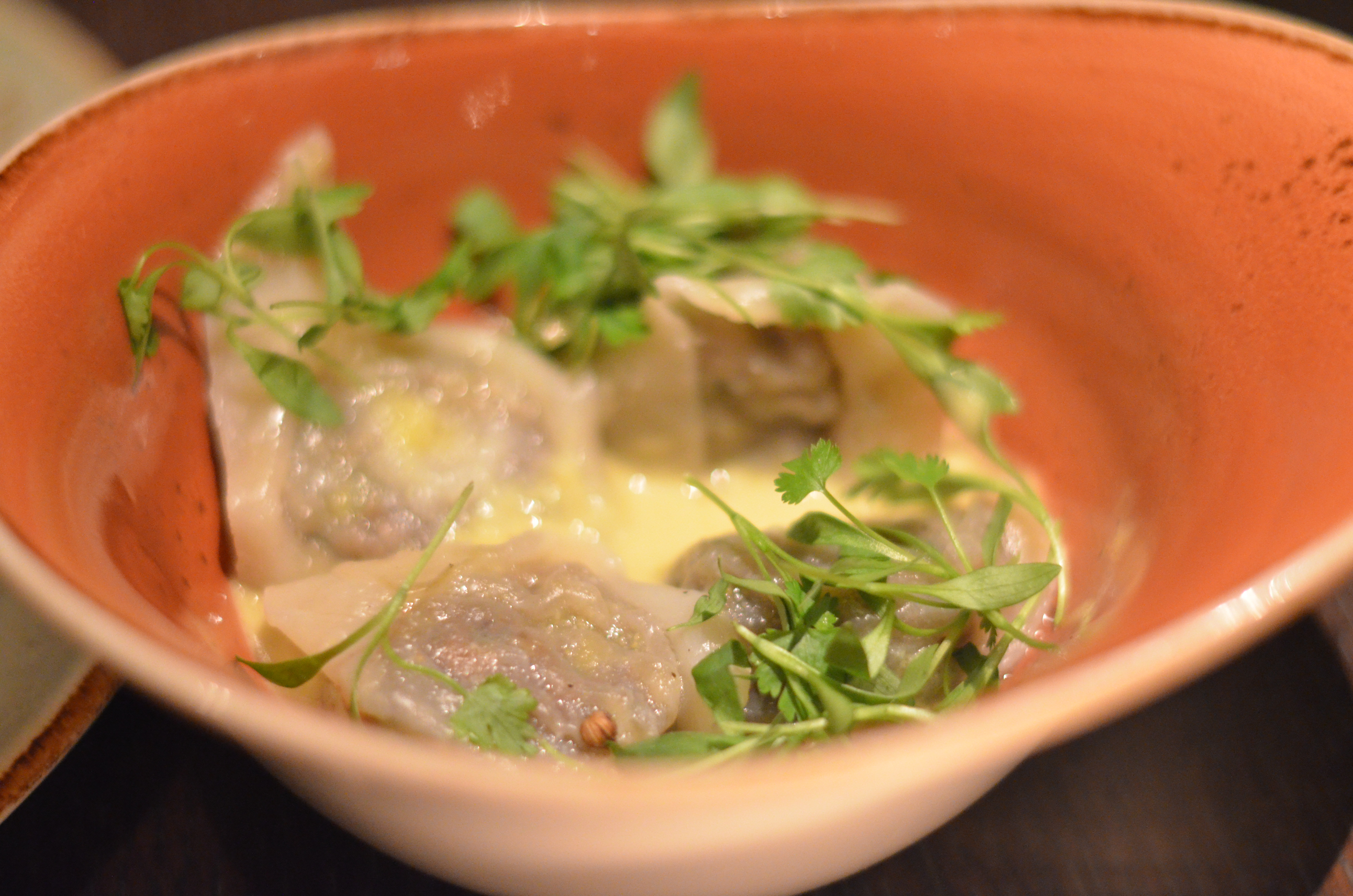 Oxtail dumplings with green apple curry sauce that tasted like a tart, curry-infused butter.