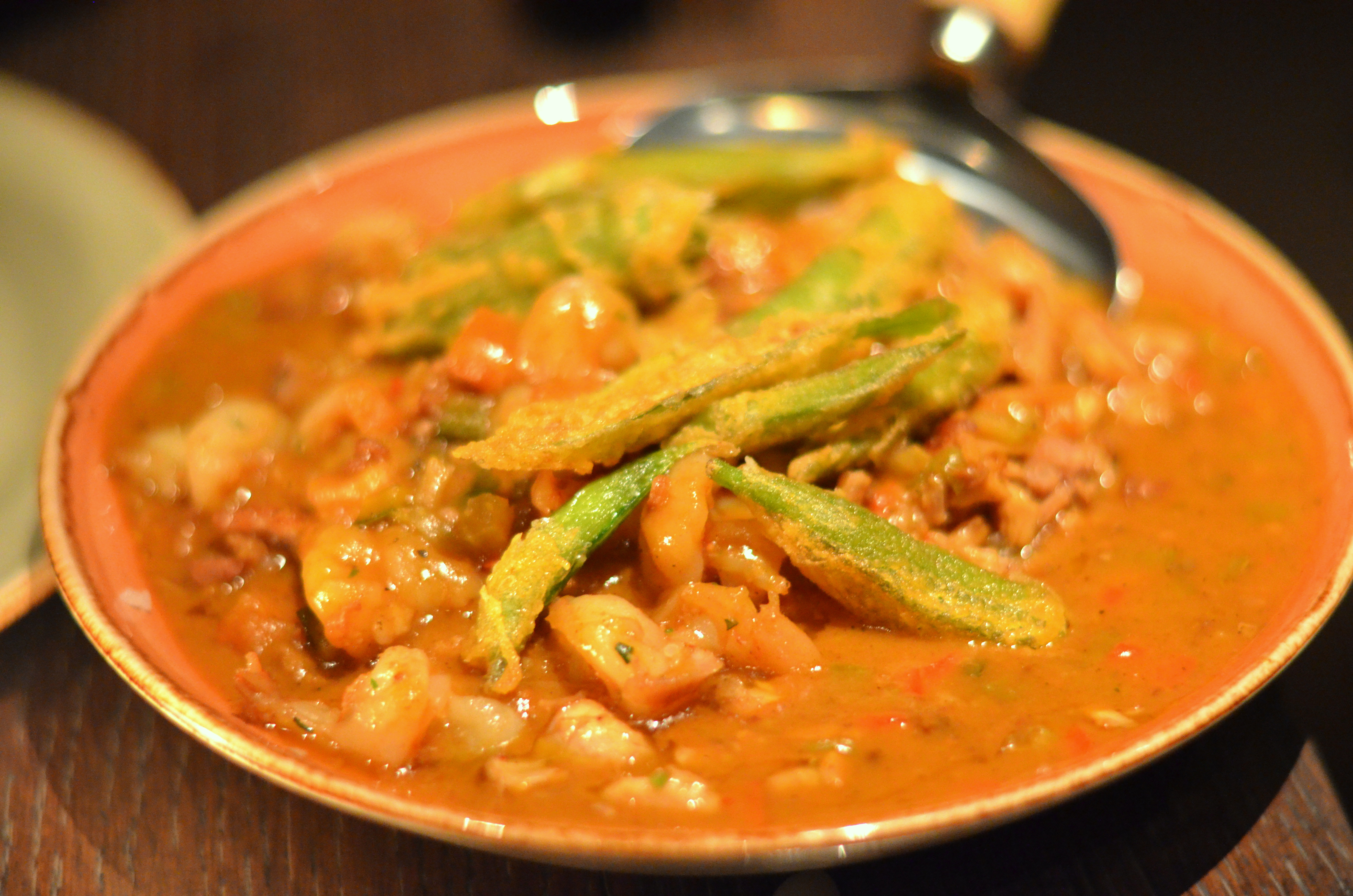 Afro/Asian/American gumbo, with smoked chicken, fried okra, sausage, and shrimp. Spicy, with a touch of sweet, and a good amount of texture to balance out the thick, luscious roux.