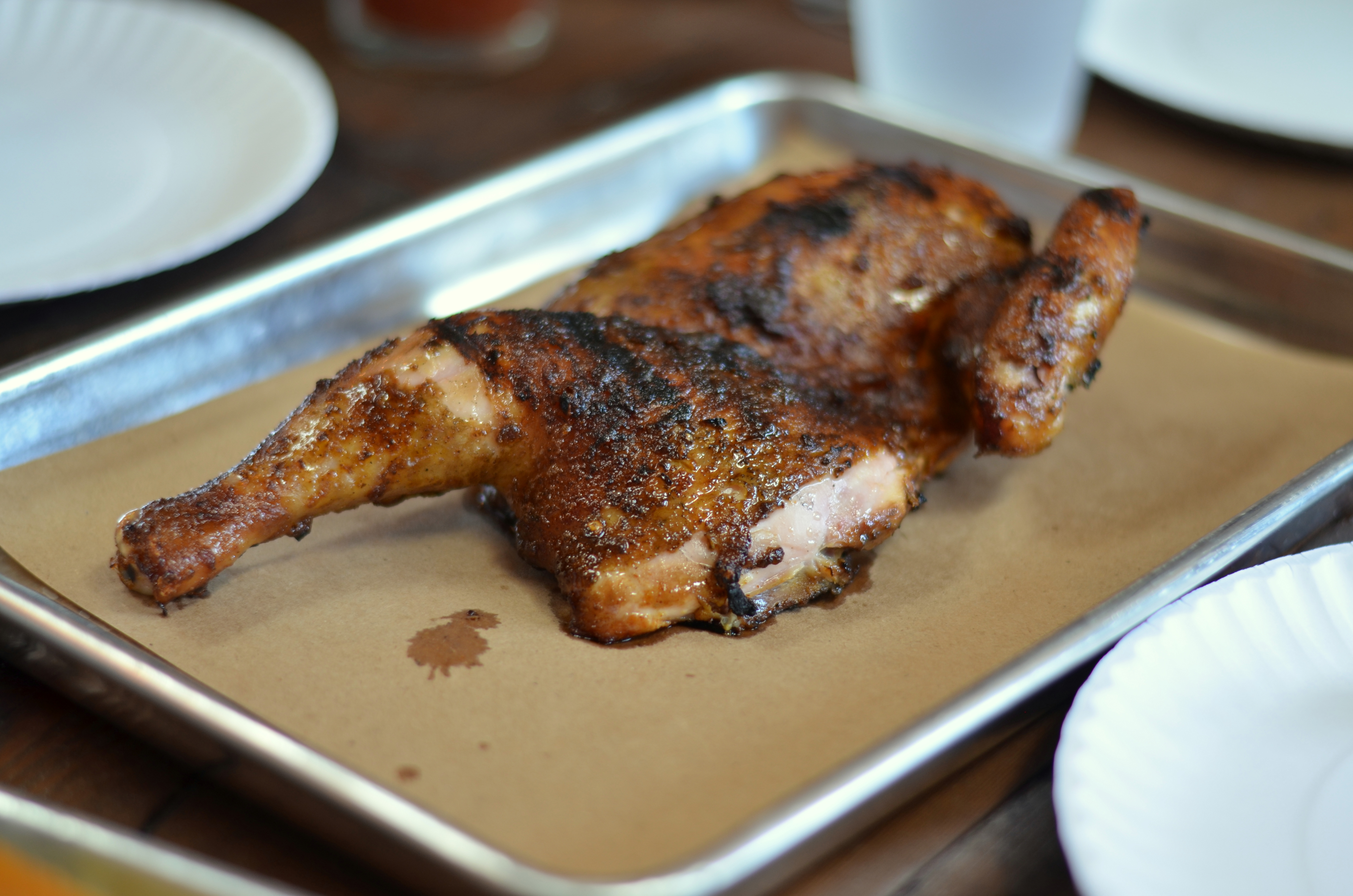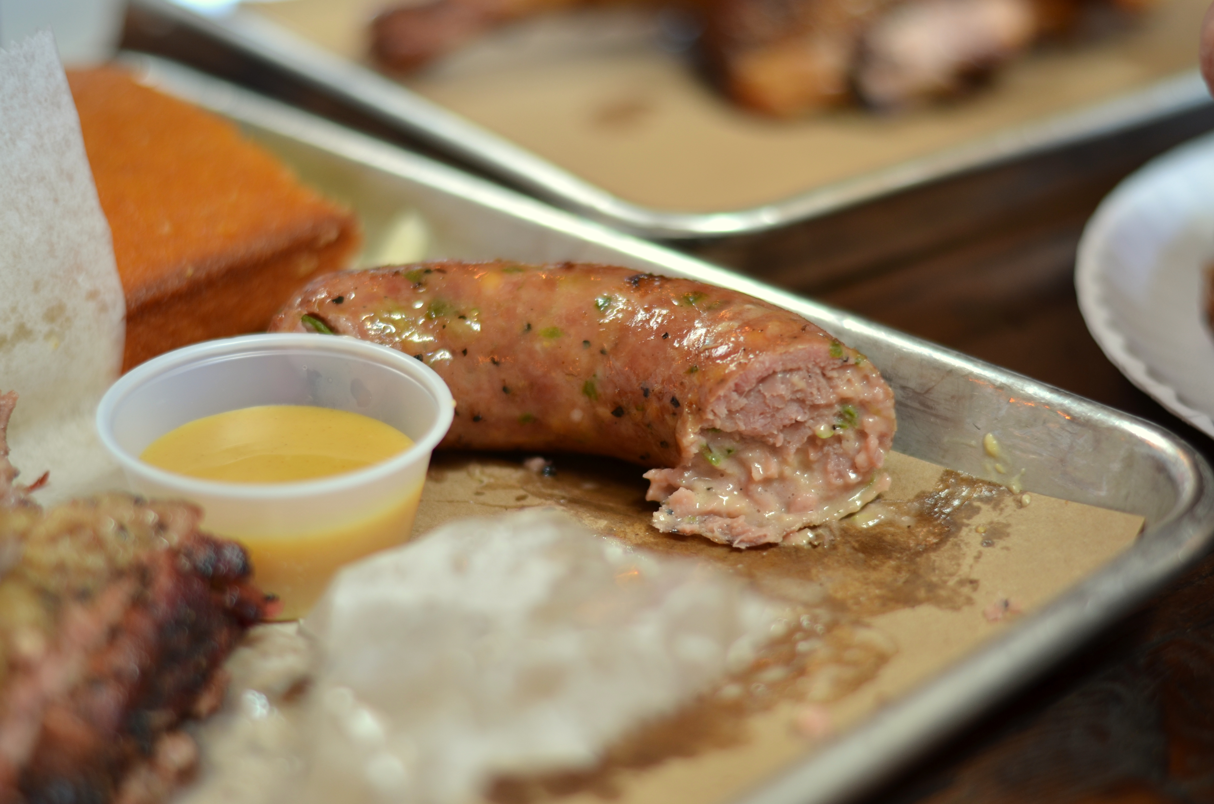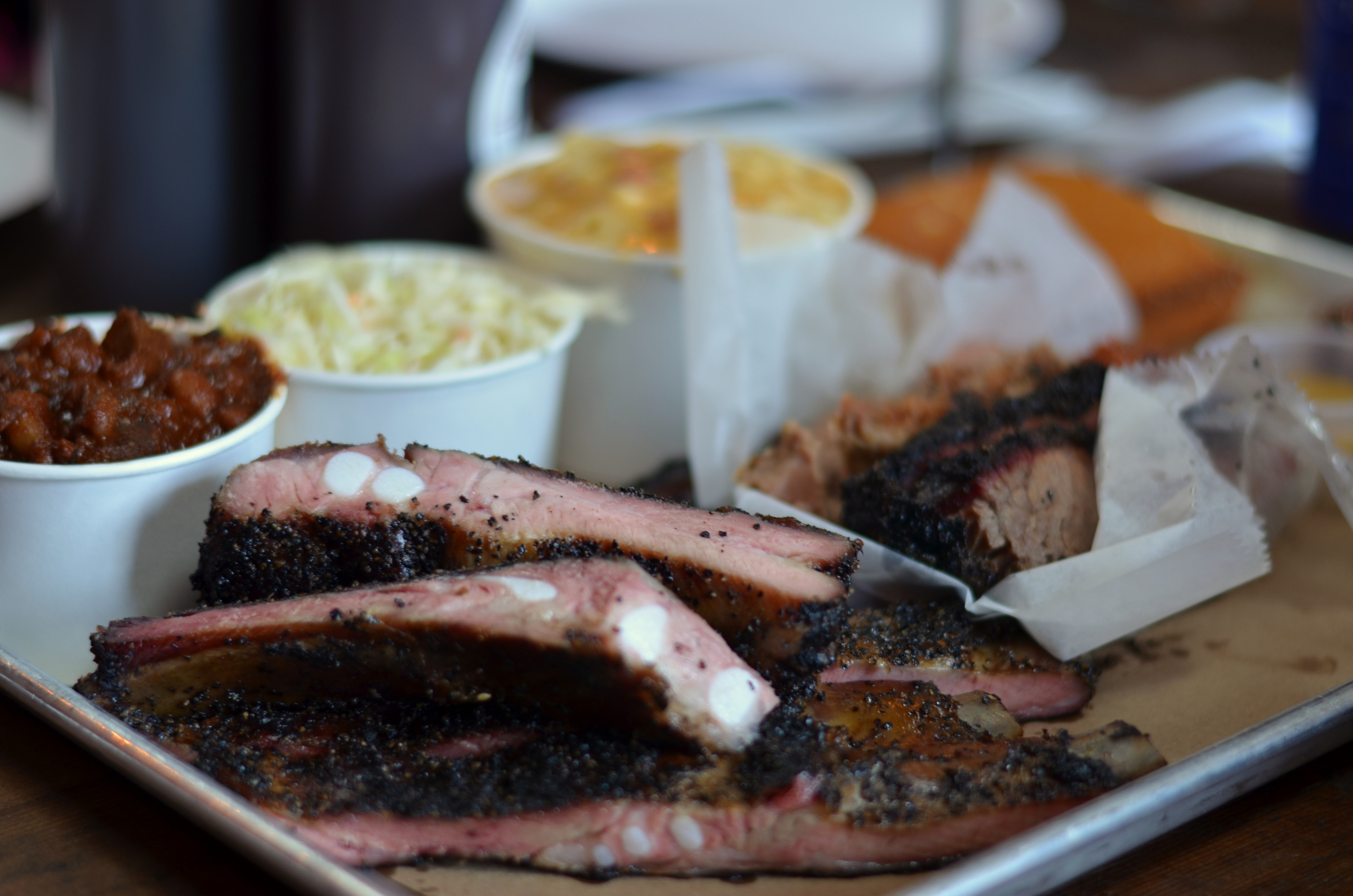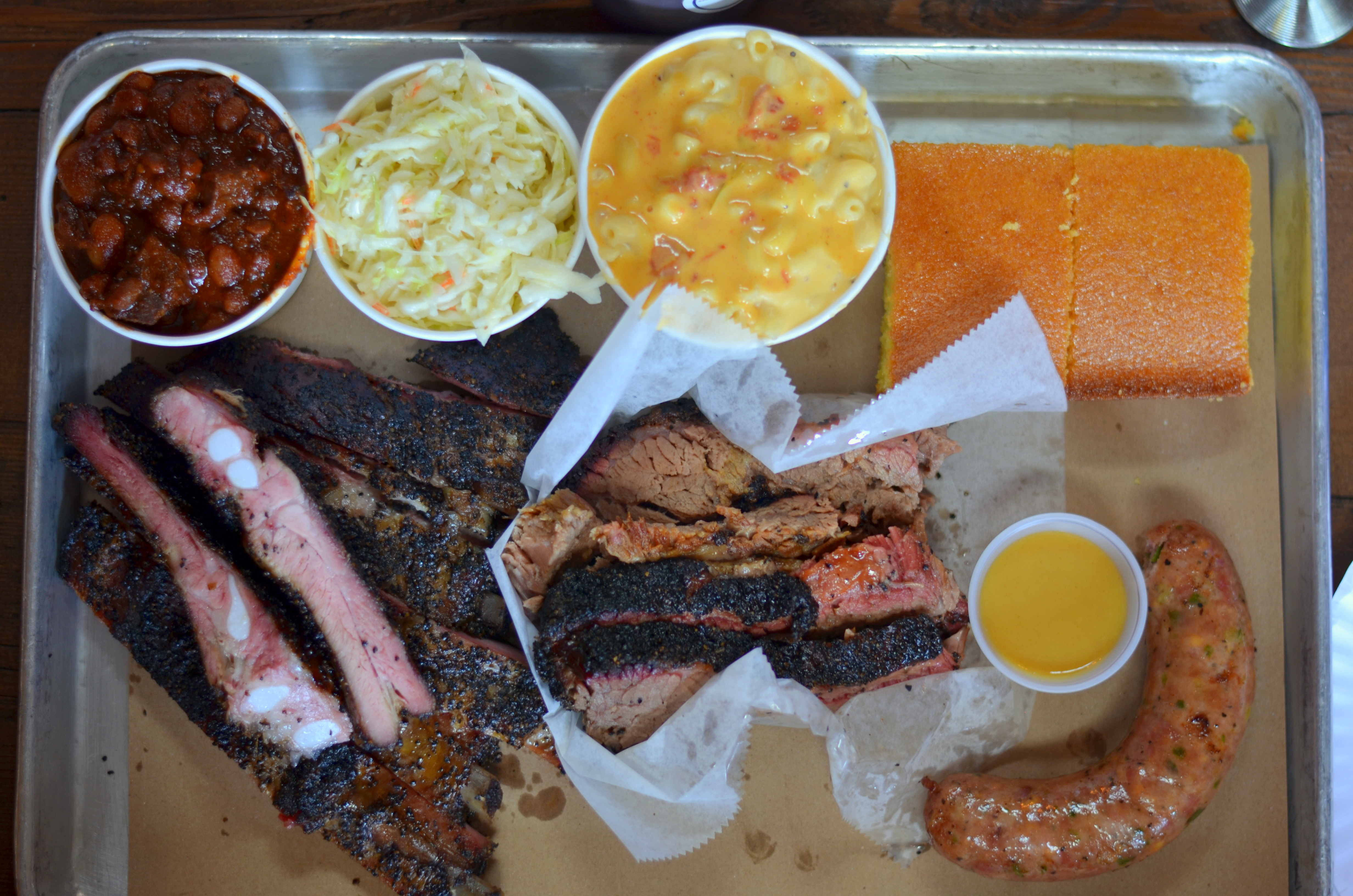 We split a tray of ribs, brisket, cheesy kielbasa, some sides (beans and burnt ends, cole slaw, mac and cheese, cornbread), plus a half-chicken.