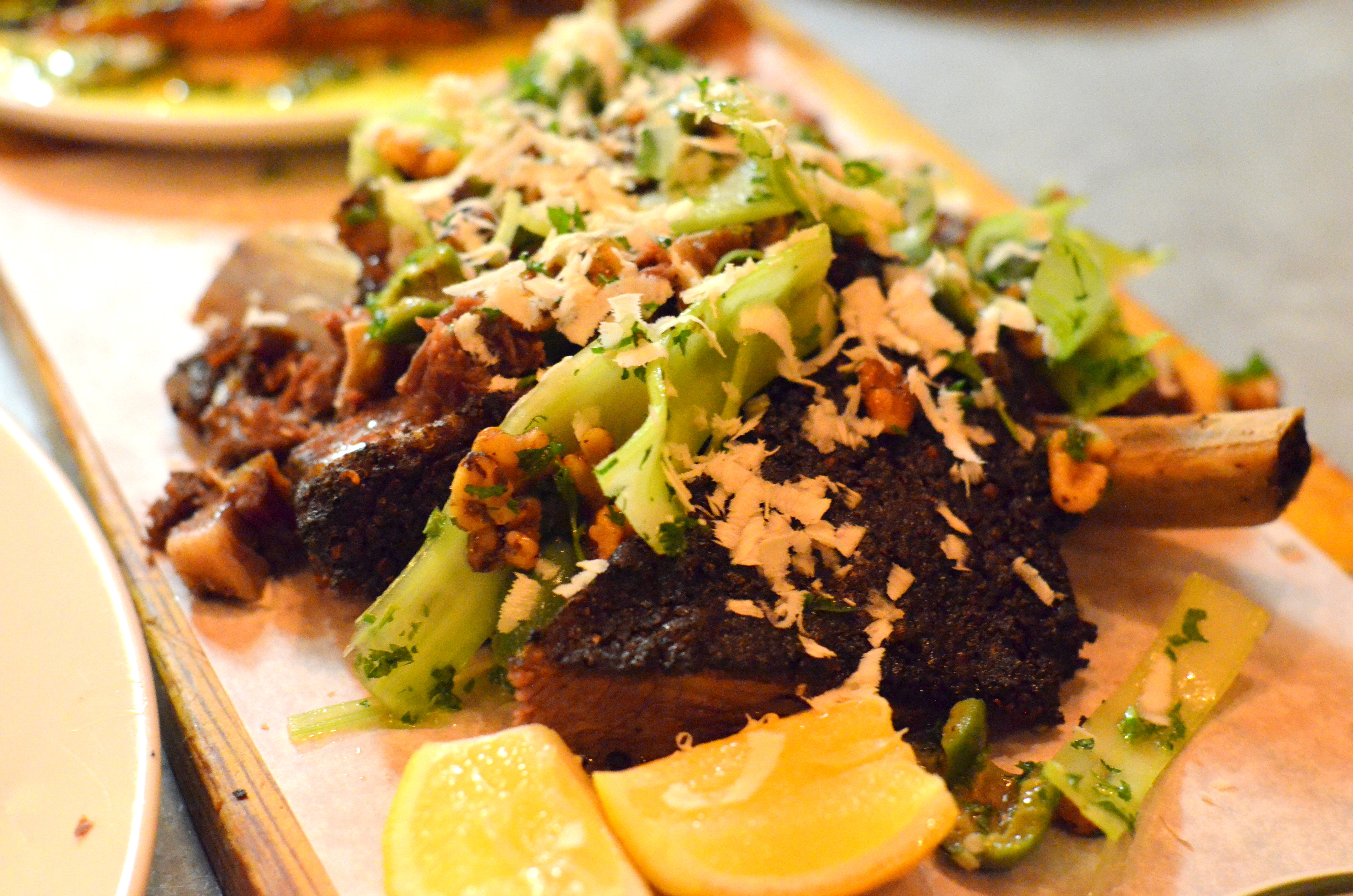 Short rib for two. This beast of bovine greatness is gigantic, tenderly delicious, mixing fat and collagen and lovingly slow-cooked, with its pepper-crusted glory, balanced with chewy green olives and lemon.