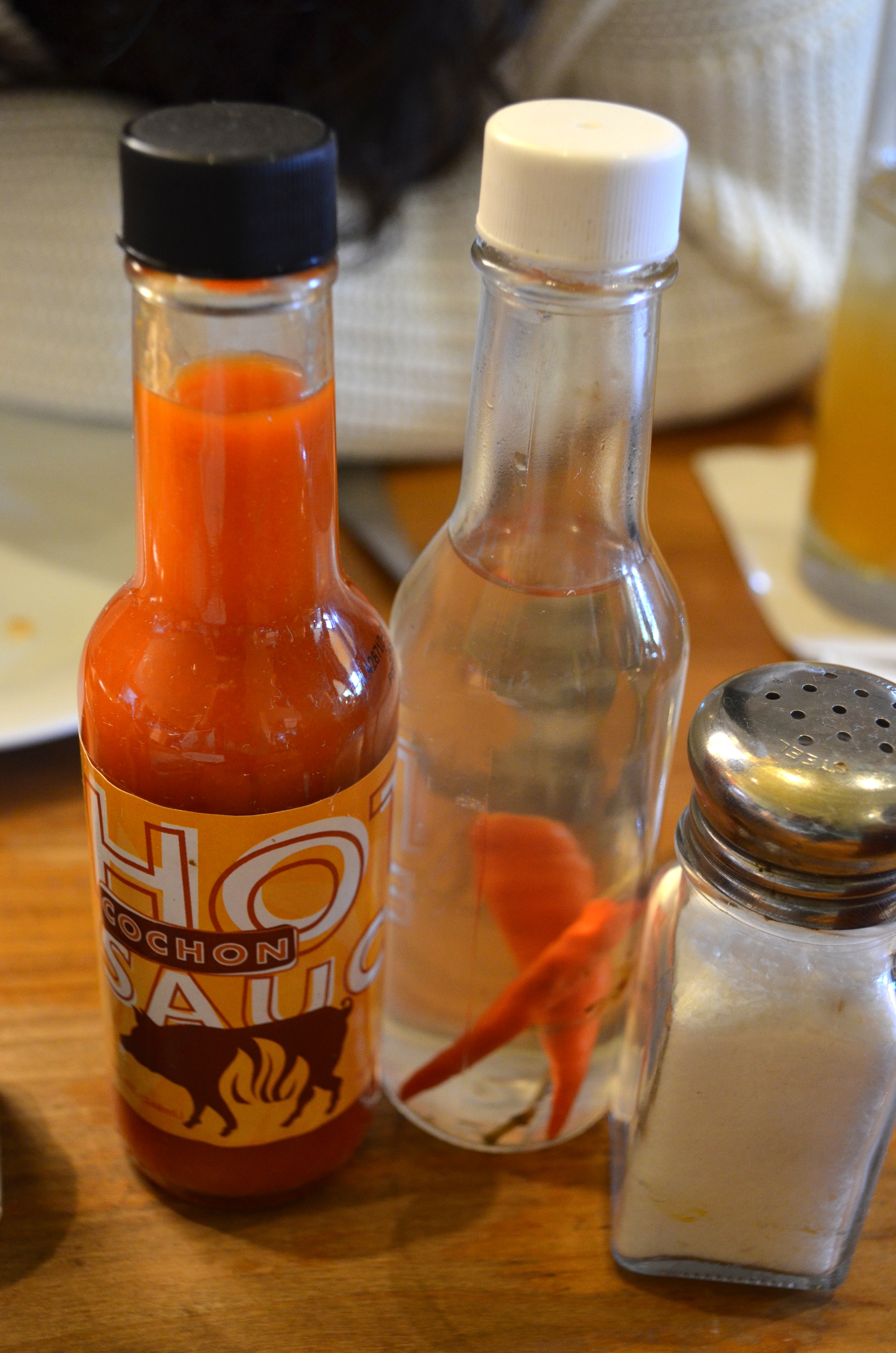 We’re having our welcome dinner during our wedding weekend at Calcasieu, which is the upstairs private dining space to Cochon. So I’m partial to the food here, its heaviness, its richness of flavor, the intensity of fat, how it seeps into your bones and drags you down into a torpor of gluttonous resignation. The menu is a hymn to pork, deep worship of all things pig. What do you not like about pork? Stop. Don’t say it. Or at least, say it out of earshot of both Cochon and myself.