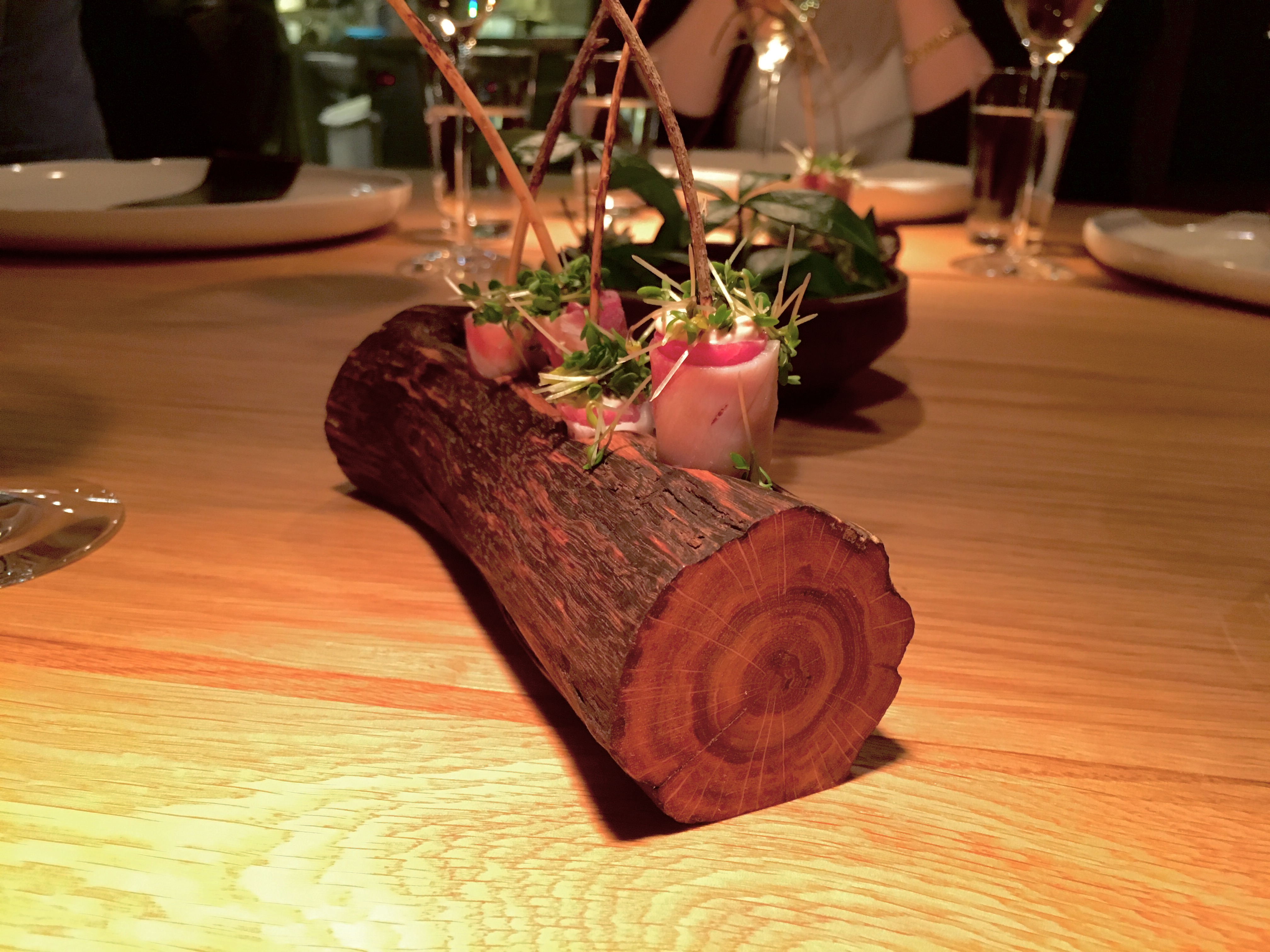 We sat at a communal table for six people, sharing the same tasting menu, some with wine pairings and myself with the juice pairing. Initially, I didn’t know we’d signed up for the communal dinner, but it turned out to be one of my favorite meal experiences – not just in an asterisk’d way (like, favorite meal in a foreign country or something) – but one of my favorite meals. It was a four-hour marathon, paved with luxurious bites and flavors, blessed with laughter and stories, that showcased the magic connectivity of what good food and drink can conjure at a dinner table of strangers.